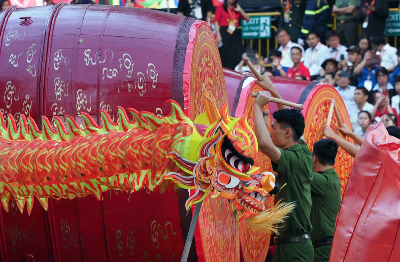 | Màn biểu diễn trống hội với chủ đề: “Bản hùng ca toàn thắng” do Đảng ủy Công an Trung ương chỉ đạo thực hiện, với 1.000 diễn viên là học viên thuộc Đoàn Nghệ thuật trống hội Học viện Cảnh sát nhân dân - Bộ Công an trình diễn. |