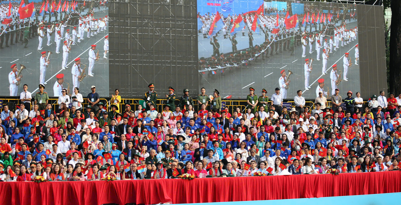 | Đi đầu đội hình diễu binh, diễu hành là Quốc huy nước Cộng hòa xã hội chủ nghĩa Việt Nam. |