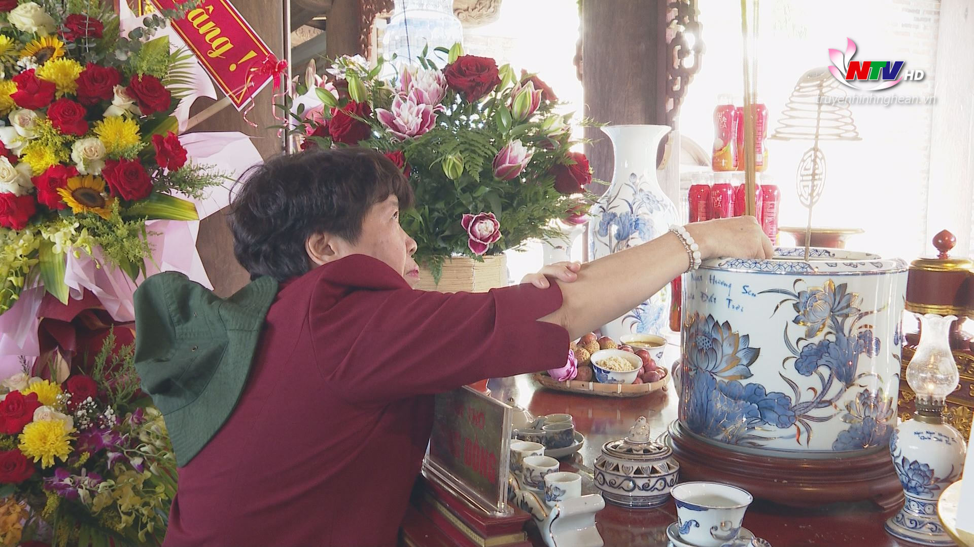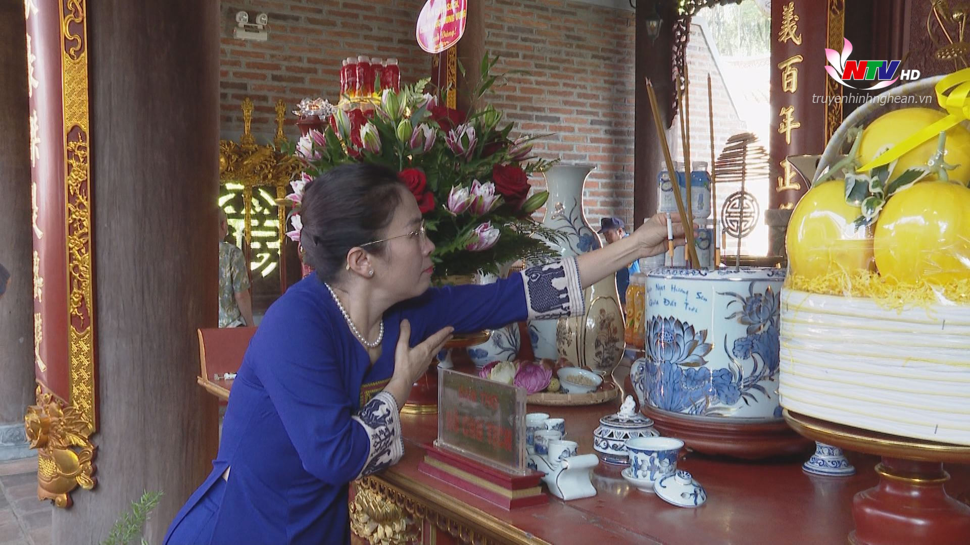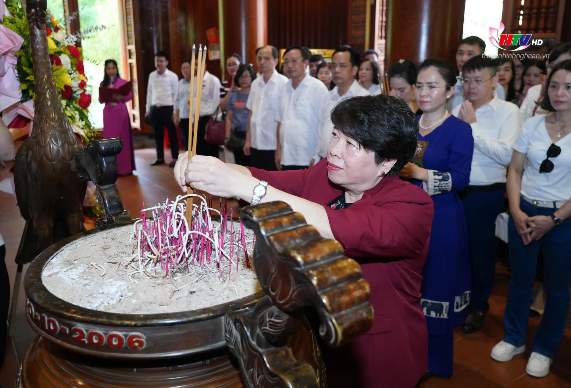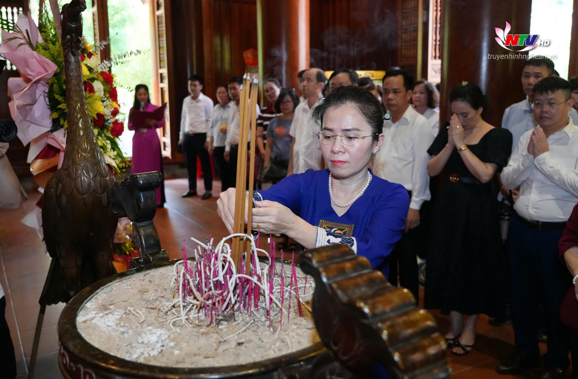 | Đồng chí Võ Thị Minh Sinh - Phó Bí thư Tỉnh ủy, Chủ tịch Uỷ ban MTTQ Việt Nam tỉnh, Trưởng Đoàn đại biểu Quốc hội tỉnh dâng hương tại bàn thờ gia tiên Chủ tịch Hồ Chí Minh. |