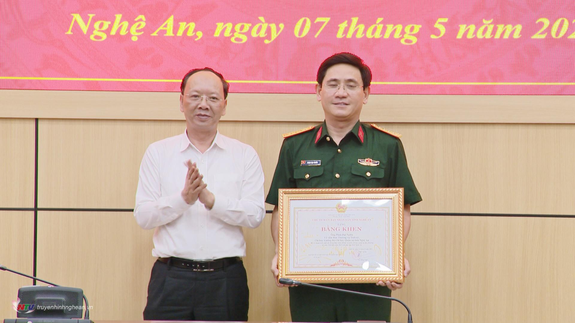 Tại hội nghị, Phó Chủ tịch Thường trực UBND tỉnh Bùi Thanh An đã trao Bằng khen của Chủ tịch UBND tỉnh cho Đại tá Phan Đại Nghĩa vì đã có thành tích xuất sắc trong thực hiện công tác quốc phòng, quân sự địa phương từ năm 2020 đến năm 2025 trên địa bàn tỉnh Nghệ An.