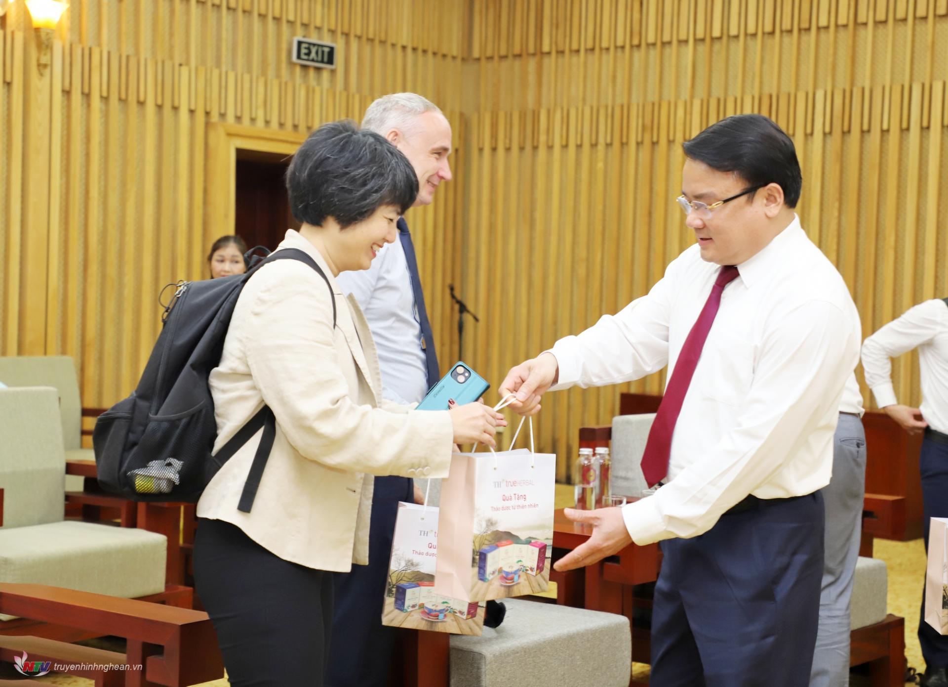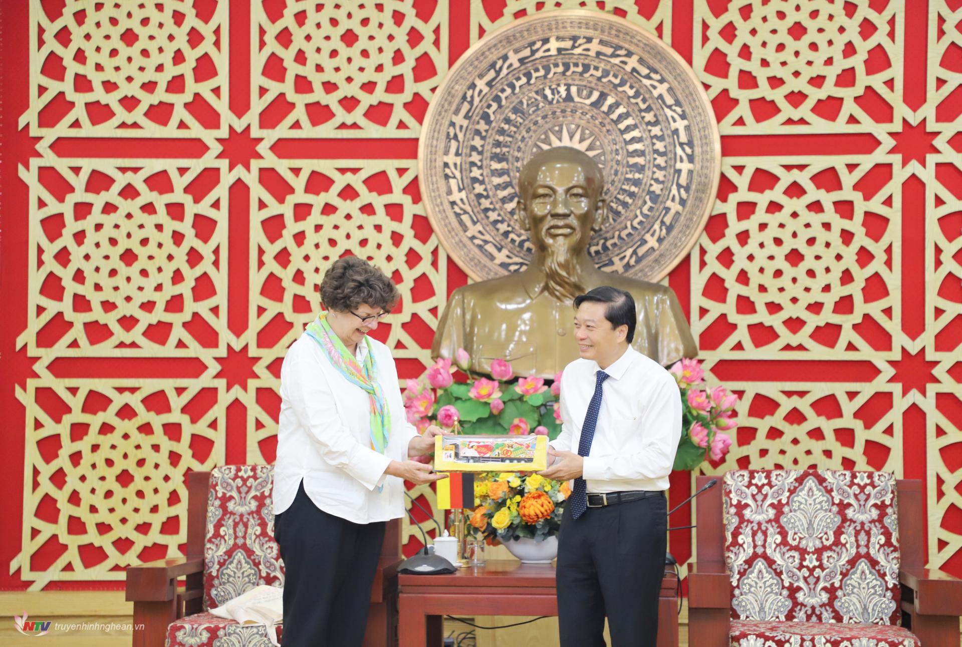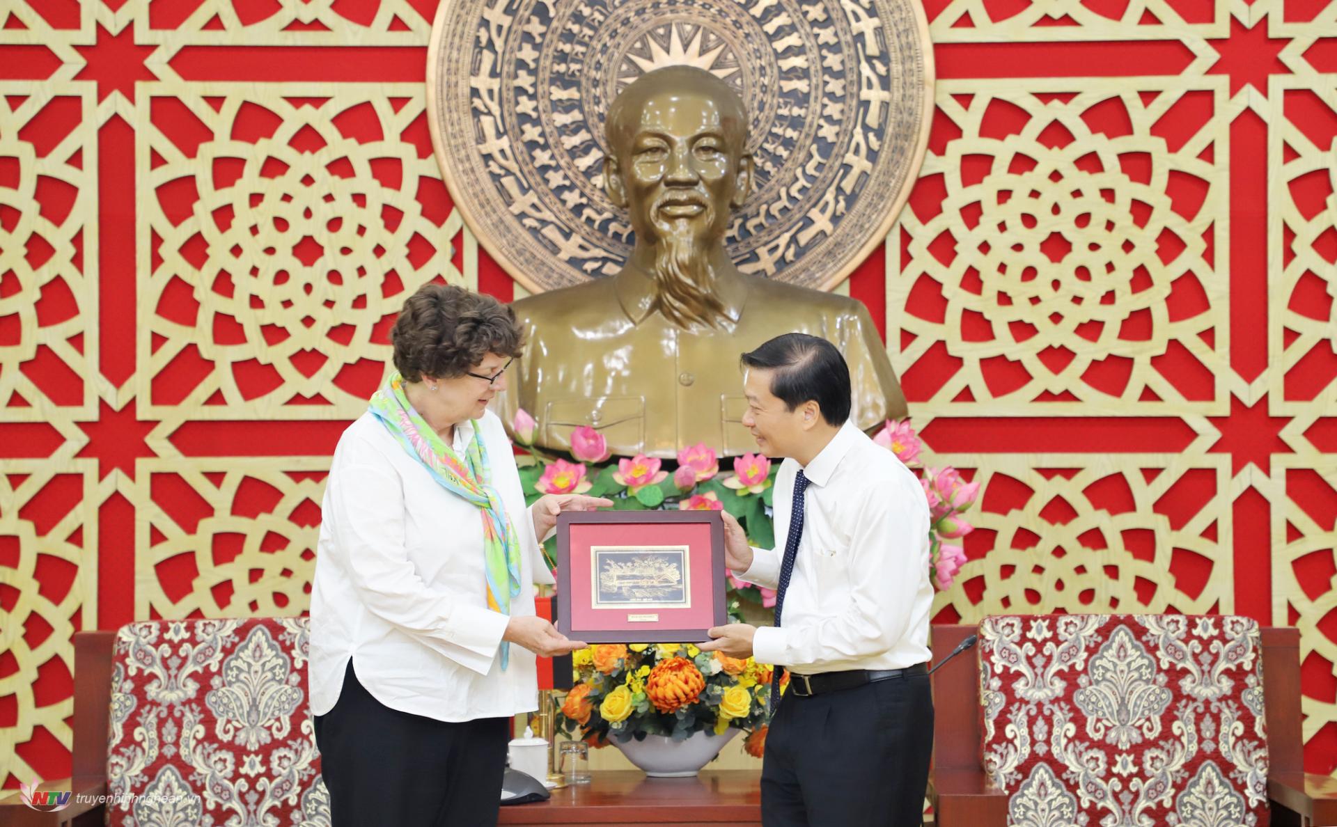 | Đại sứ Đặc mệnh toàn quyền CHLB Đức tại Việt Nam Helga Margarete Barth trao món quà lưu niệm đến lãnh đạo tỉnh Nghệ An. |