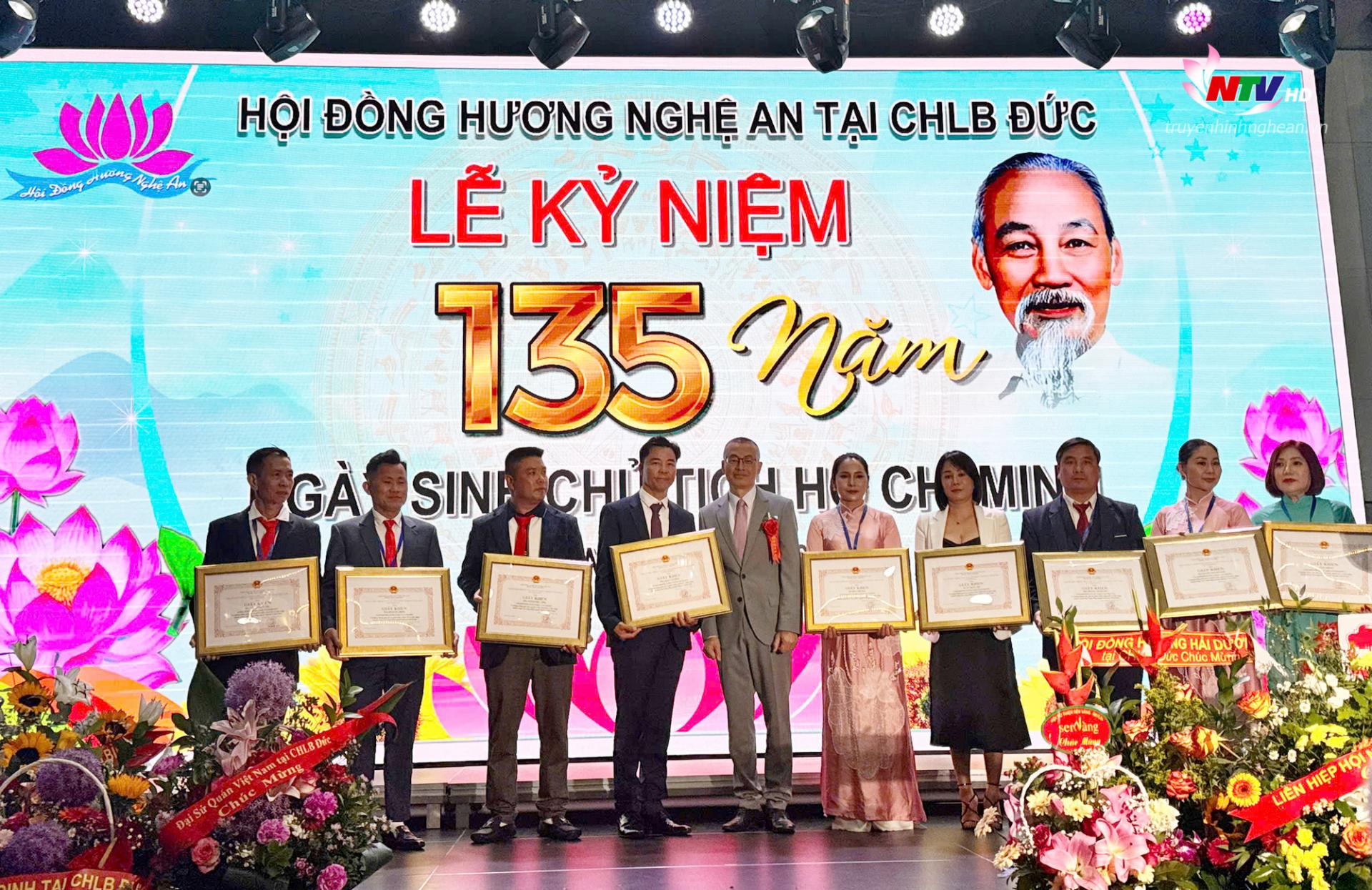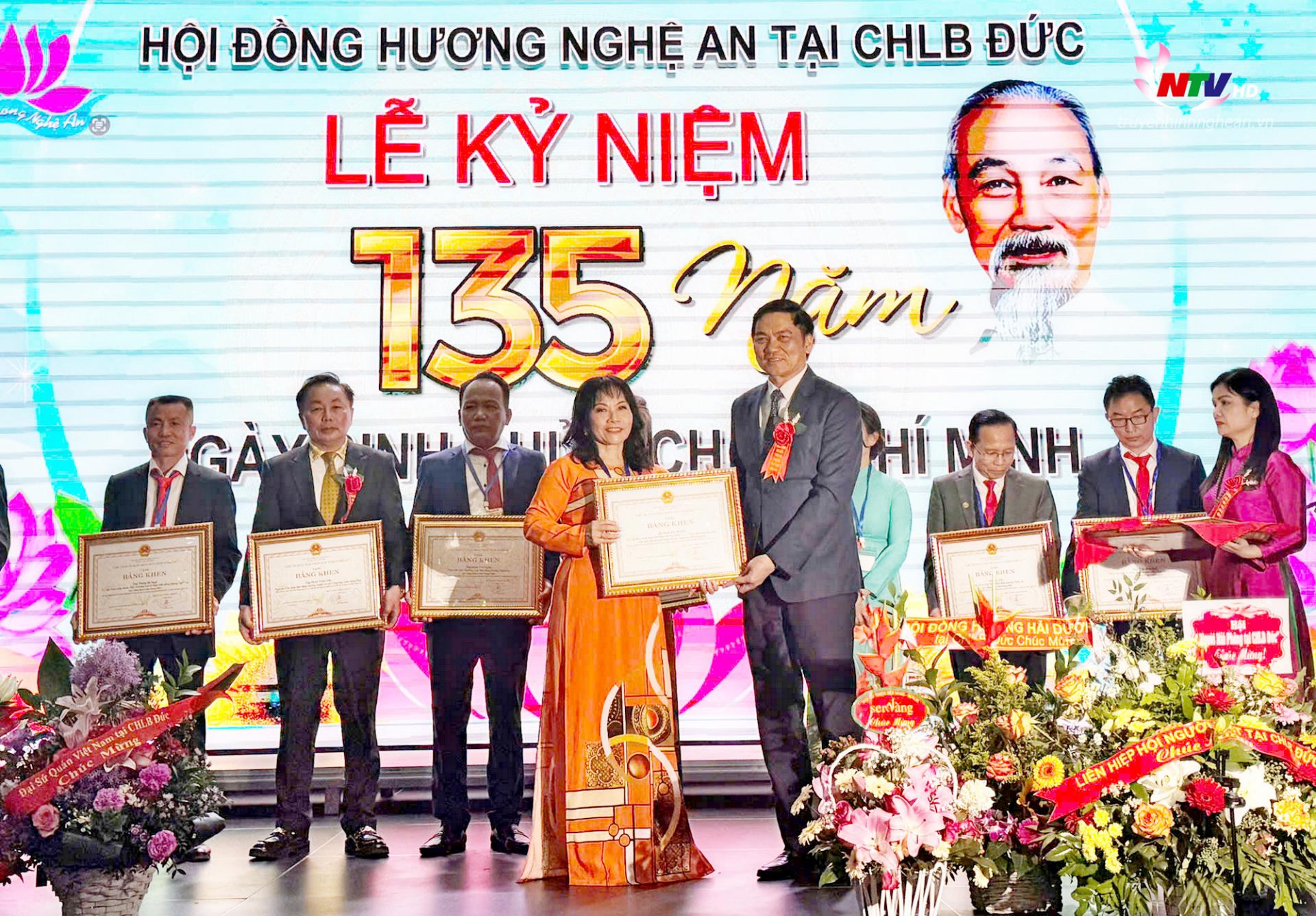 Nhằm ghi nhận những đóng góp tích cực của cộng đồng kiều bào tại Đức, tại buổi lễ, 10 cá nhân trong Hội đồng hương Nghệ An tại CHLB Đức đã được trao Bằng khen của UBND tỉnh Nghệ An vì đã có thành tích tiêu biểu đóng góp cho sự nghiệp xây dựng và phát triển kinh tế - xã hội tỉnh Nghệ An. Đại sứ Vũ Quang Minh đã trao Giấy khen của Đại sứ quán Việt Nam tại CHLB Đức cho Hội đồng hương Nghệ An vì những đóng góp trong công tác cộng đồng và quảng bá hình ảnh quê hương.