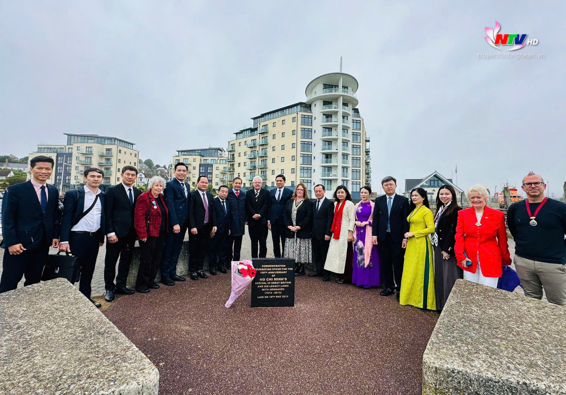 | Đoàn đại biểu tỉnh Nghệ An, Đại sứ quán Việt Nam tại Liên hiệp Vương quốc Anh và Bắc Ai-len cùng lãnh đạo thị trấn Newhaven chụp ảnh lưu niệm tại Bia tưởng niệm Chủ tịch Hồ Chí Minh trên bến cảng thị trấn Newhaven. |