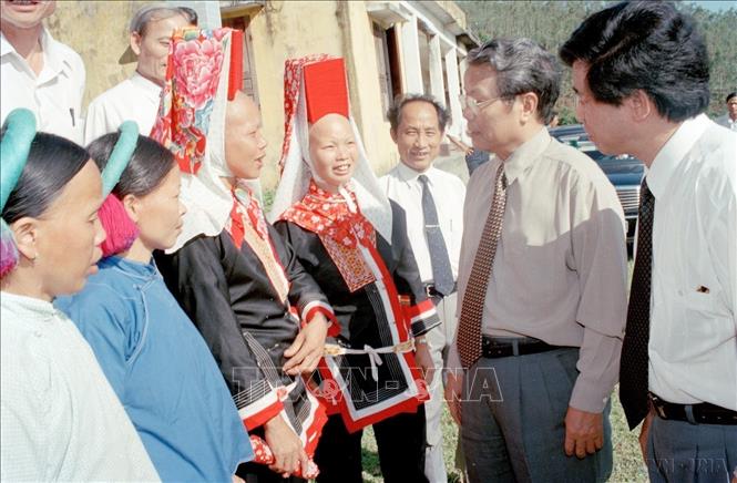 | Chủ tịch nước Trần Đức Lương nói chuyện với đồng bào các dân tộc xã Phong Dụ, huyện miền núi Tiên Yên (Quảng Ninh), năm 1997. |