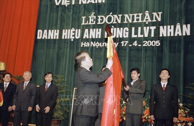 | Chủ tịch nước Trần Đức Lương trao tặng Danh hiệu Anh hùng Lực lượng vũ trang nhân dân cho Thông tấn xã Việt Nam, ngày 17/4/2005. |