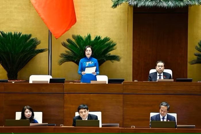 Chủ nhiệm Ủy ban Kinh tế và Tài chính của Quốc hội trình bày Báo cáo thẩm tra dự thảo Nghị quyết của Quốc hội về giảm thuế giá trị gia tăng.