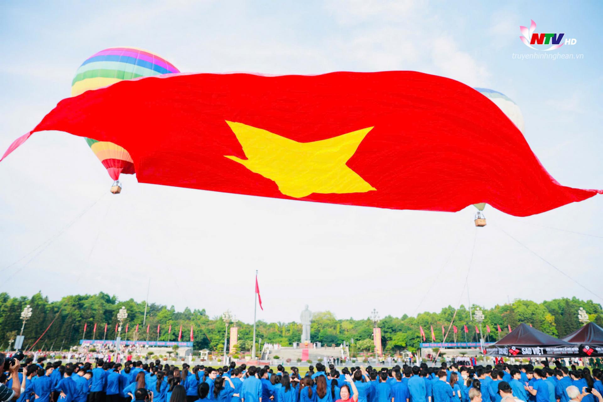 Đại kỳ Tổ quốc có kích thước 2025m² được bay lên tại Quảng trường Hồ Chí Minh - không gian mang đậm dấu ấn lịch sử và tinh thần dân tộc, góp phần khơi dậy niềm tự hào, ý thức trách nhiệm của mỗi người dân với Tổ quốc. Lễ chào cờ và bay đại kỳ không chỉ là nghi lễ thiêng liêng mà còn là thông điệp mạnh mẽ khẳng định niềm tin, khát vọng phát triển vươn lên của quê hương Nghệ An trong thời kỳ mới.