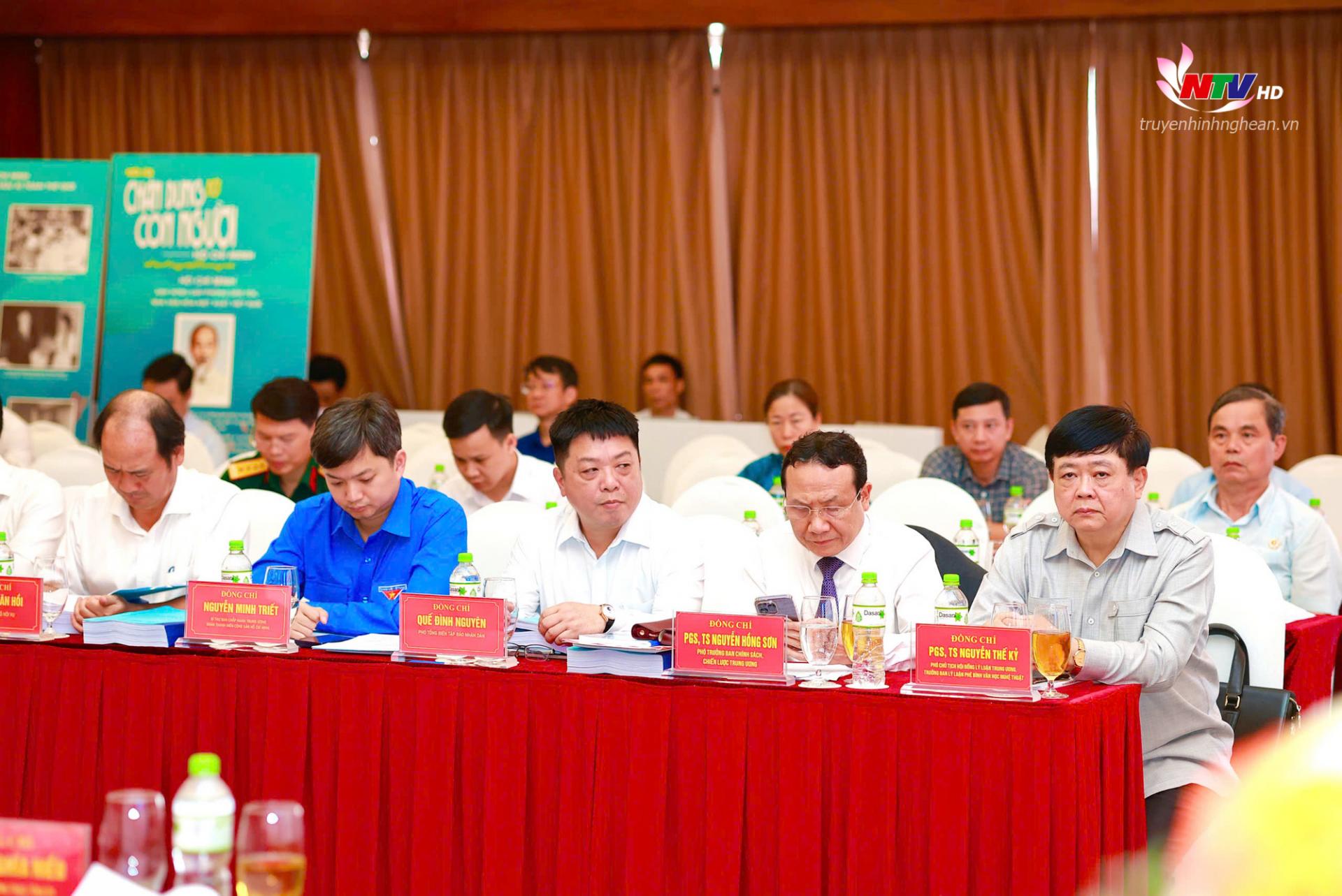 | Các đồng chí: GS.TS Nguyễn Xuân Thắng - Ủy viên Bộ Chính trị, Giám đốc Học viện Chính trị quốc gia Hồ Chí Minh, Chủ tịch Hội đồng Lý luận Trung ương; Đại tướng Lương Tam Quang - Ủy viên Bộ Chính trị, Bộ trưởng Bộ Công an; Phạm Tất Thắng - Ủy viên Ban Chấp hành Trung ương Đảng, Phó Trưởng ban Tuyên giáo và Dân vận Trung ương; Nguyễn Thanh Nghị - Ủy viên Ban Chấp hành Trung ương Đảng, Phó Bí thư Thường trực Thành ủy Thành phố Hồ Chí Minh; GS.TS Lê Văn Lợi - Phó Giám đốc Học viện Chính trị quốc gia Hồ Chí Minh và đồng chí Nguyễn Đức Trung - Bí thư Tỉnh uỷ Nghệ An chủ trì Hội thảo. |