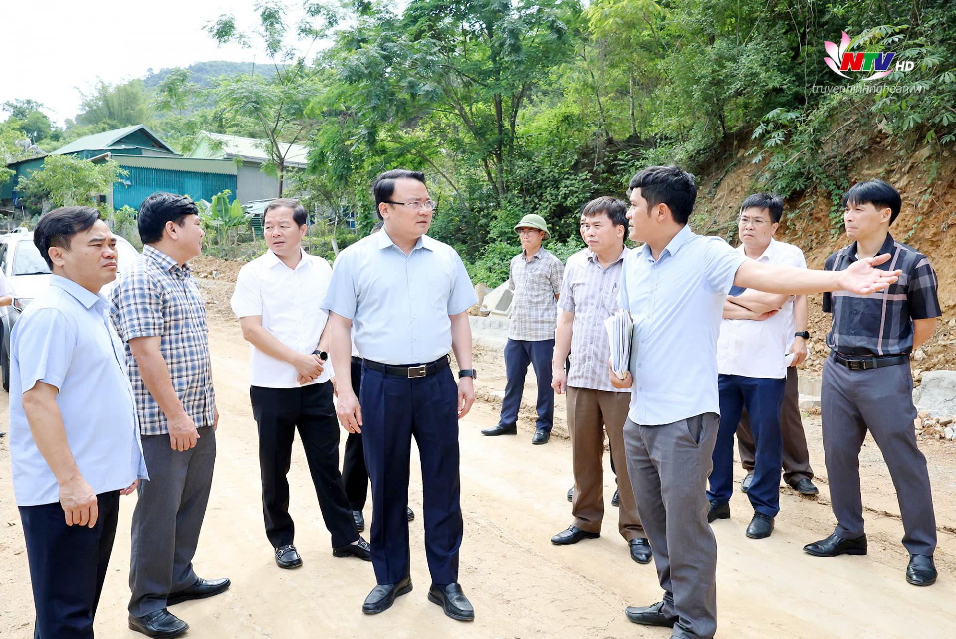 | Phó Chủ tịch UBND tỉnh Phùng Thành Vinh và các thành viên đoàn công tác kiểm tra hiện trường Dự án Nâng cấp tuyến đường từ trung tâm xã Môn Sơn đi bản Khe Búng. |