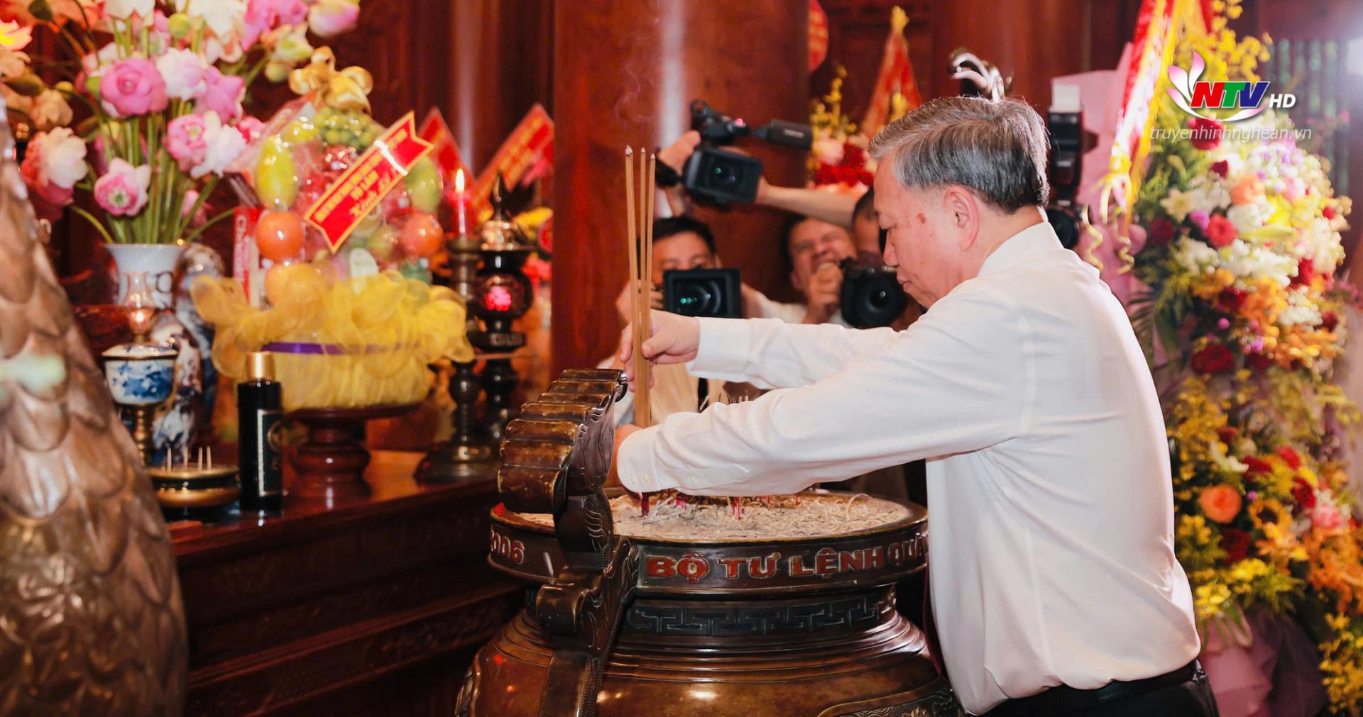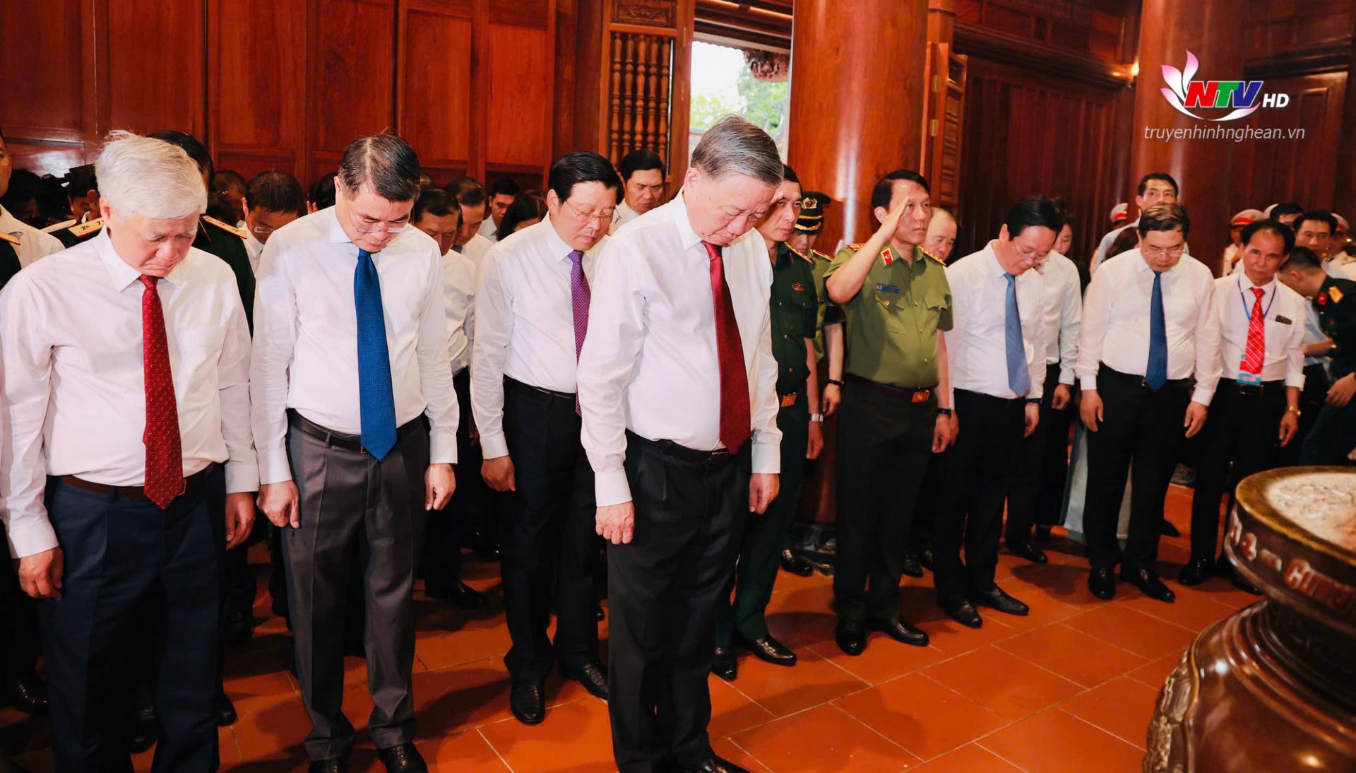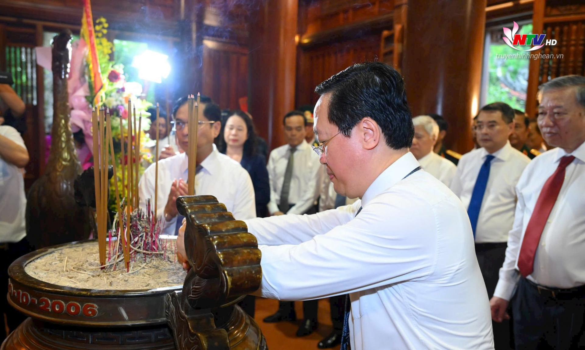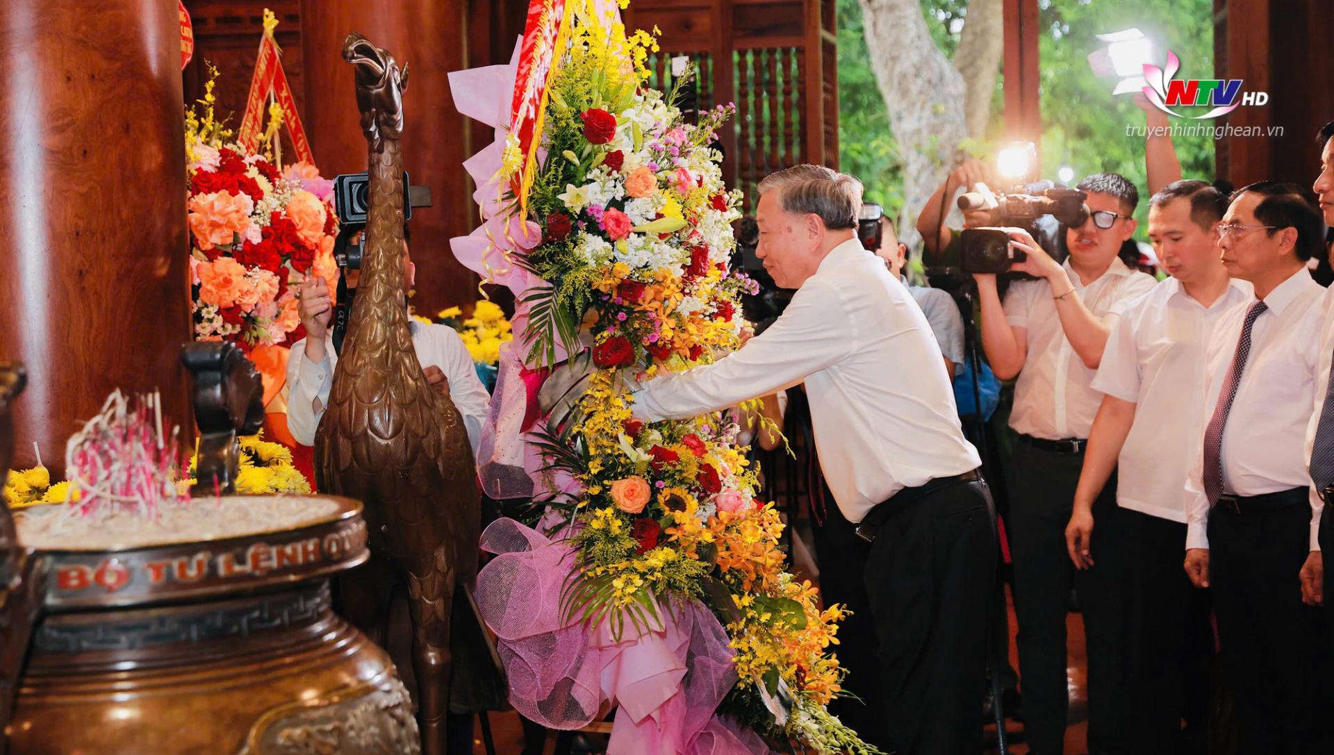 Tổng Bí thư Tô Lâm cùng đoàn đại biểu đã thành kính dâng hoa, dâng hương, tưởng niệm, bày tỏ lòng biết ơn sâu sắc đối với Chủ tịch Hồ Chí Minh và những người thân yêu trong gia đình của Bác tại Đền Chung Sơn - đền thờ gia tiên Chủ tịch Hồ Chí Minh.