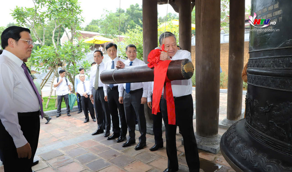 | Đồng chí Tổng Bí thư Tô Lâm thỉnh chuông tại Đền thờ Chung Sơn - đền thờ gia tiên Chủ tịch Hồ Chí Minh. |