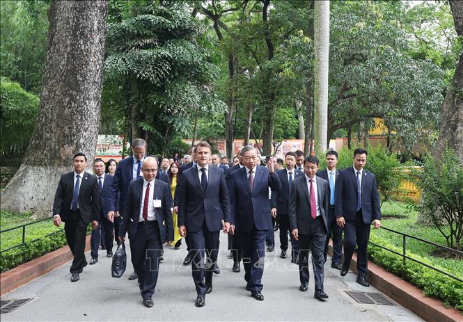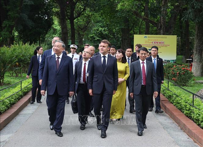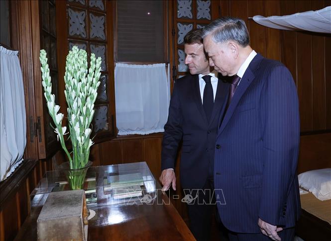 | Tổng Bí thư Tô Lâm và Tổng thống Pháp thăm Khu di tích Chủ tịch Hồ Chí Minh tại Phủ Chủ tịch. |