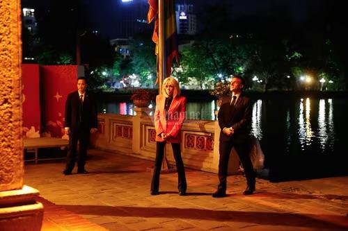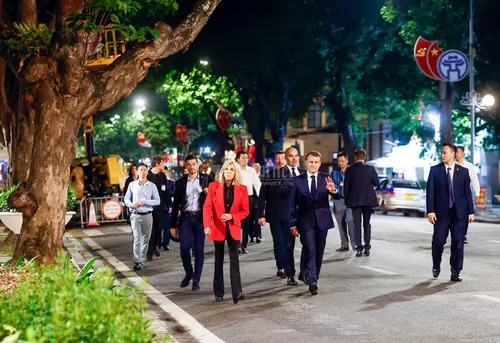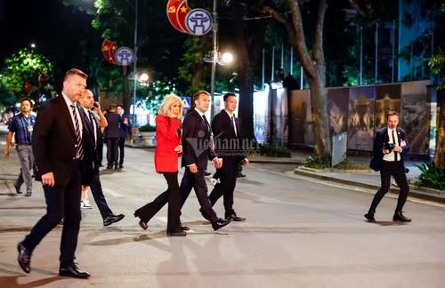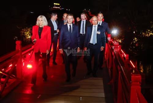 Ông Macron và bà Brigitte đi bộ cùng một số cận vệ, từ phố Lý Thái Tổ, ra phố Lê Lai - nơi có tượng đài Vua Lý Thái Tổ. Tiếp đó, Tổng thống và Phu nhân thăm Đền Ngọc Sơn, sau đó đi bộ một vòng quanh Hồ Gươm.