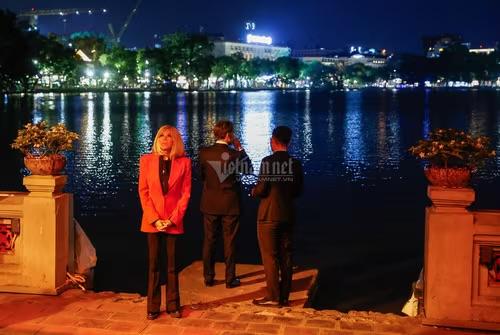 Người dân tập thể dục đêm tại khu vực Hồ Gươm ngỡ ngàng khi nhận ra Tổng thống Pháp và Phu nhân.