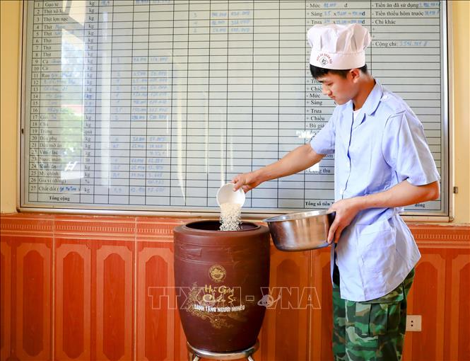 | Tại Đồn Biên phòng Mường Mươn (huyện Mường Chà, tỉnh Điện Biên), trước mỗi giờ nấu cơm, chiến sĩ lại bớt một bát gạo để cho vào “Hũ gạo Chiến sĩ”. Ảnh: Xuân Tư/ TTXVN |