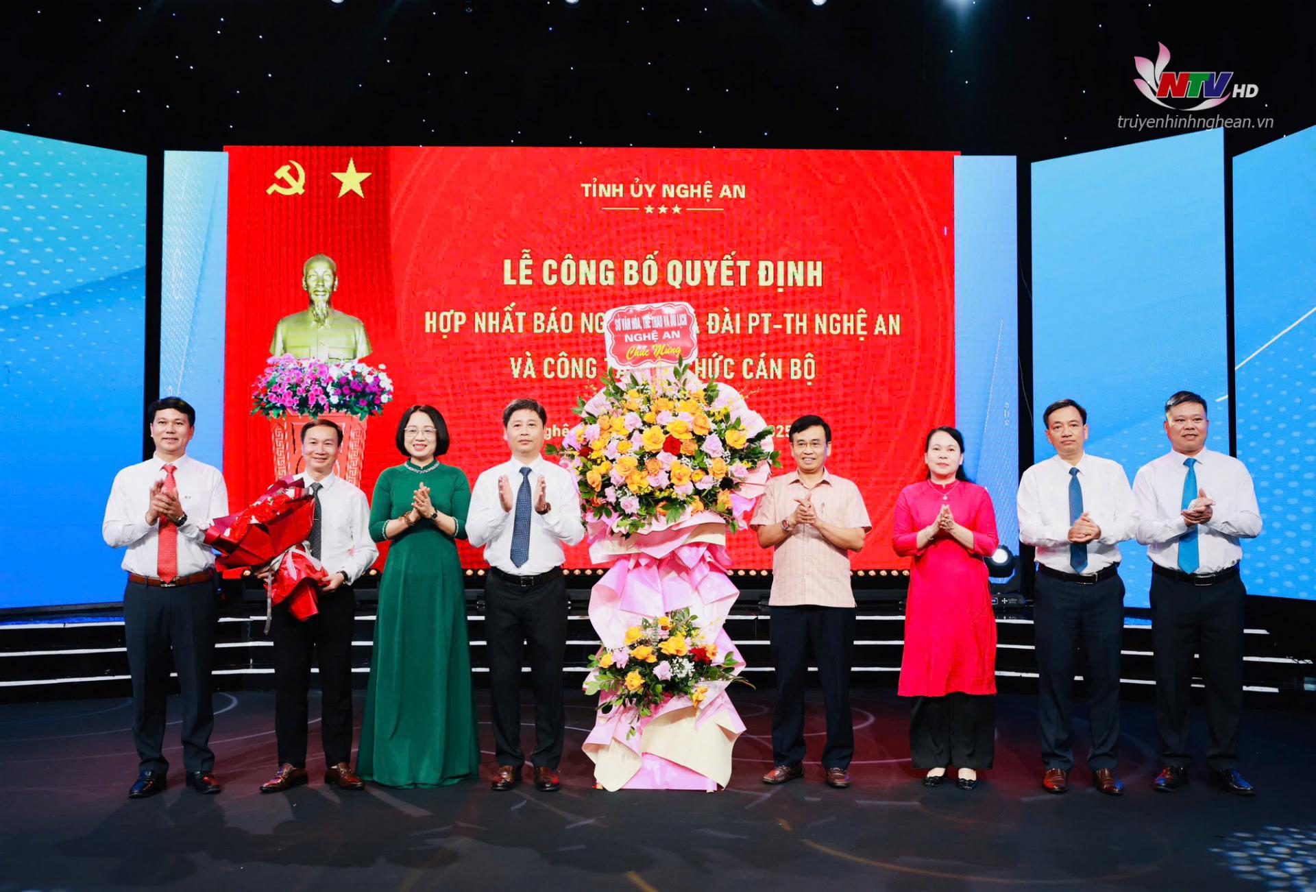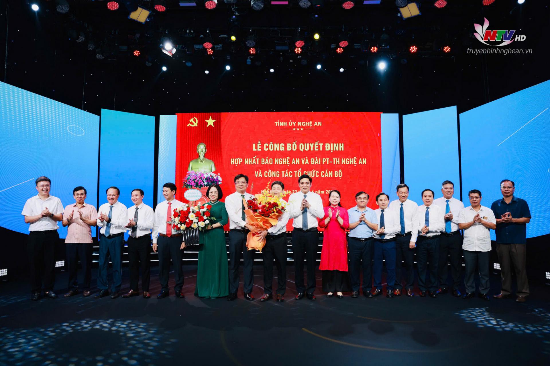 | Các đồng chí lãnh đạo tỉnh và các Sở, ban ngành tặng hoa chúc mừng Báo và Đài PTTH Nghệ An. |