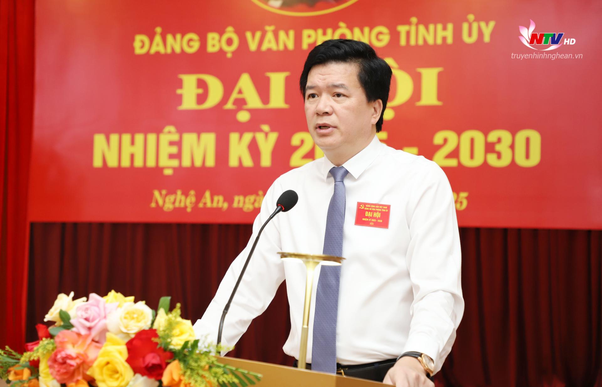 Phát biểu chỉ đạo Đại hội, đồng chí Hoàng Nghĩa Hiếu - Phó Bí thư Thường trực Tỉnh ủy ghi nhận, đánh giá cao về những kết quả đạt được của Đảng bộ văn phòng Tỉnh ủy trong nhiệm kỳ qua.