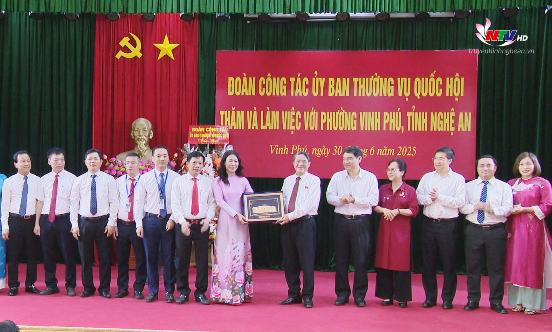 | Phó Chủ tịch Quốc hội Nguyễn Đức Hải trao quà lưu niệm tặng Đảng ủy, chính quyền phường Vinh Phú. |