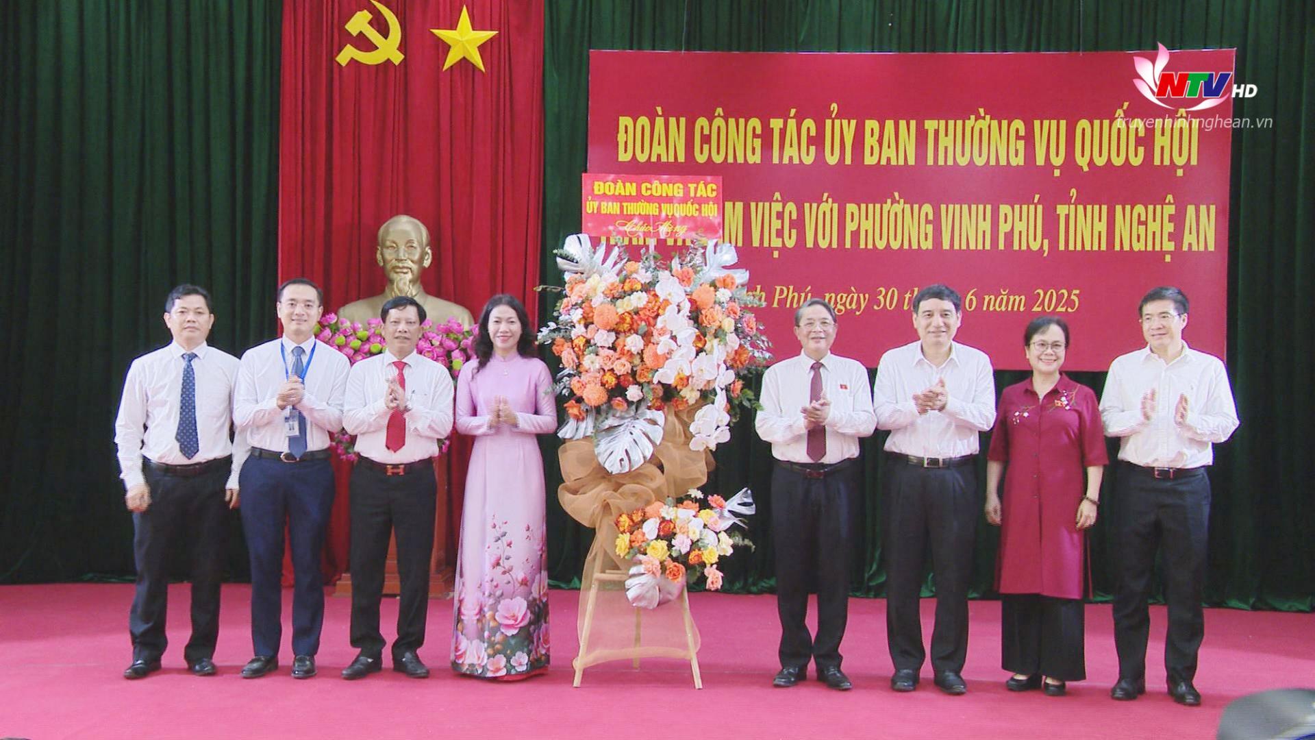 | Phó Chủ tịch Quốc hội Nguyễn Đức Hải cùng đoàn công tác tặng hoa chúc mừng lãnh đạo phường Vinh Phú hoàn thành việc sáp nhập theo chủ trương của Trung ương và các Nghị quyết của Ủy ban Thường vụ Quốc hội. |