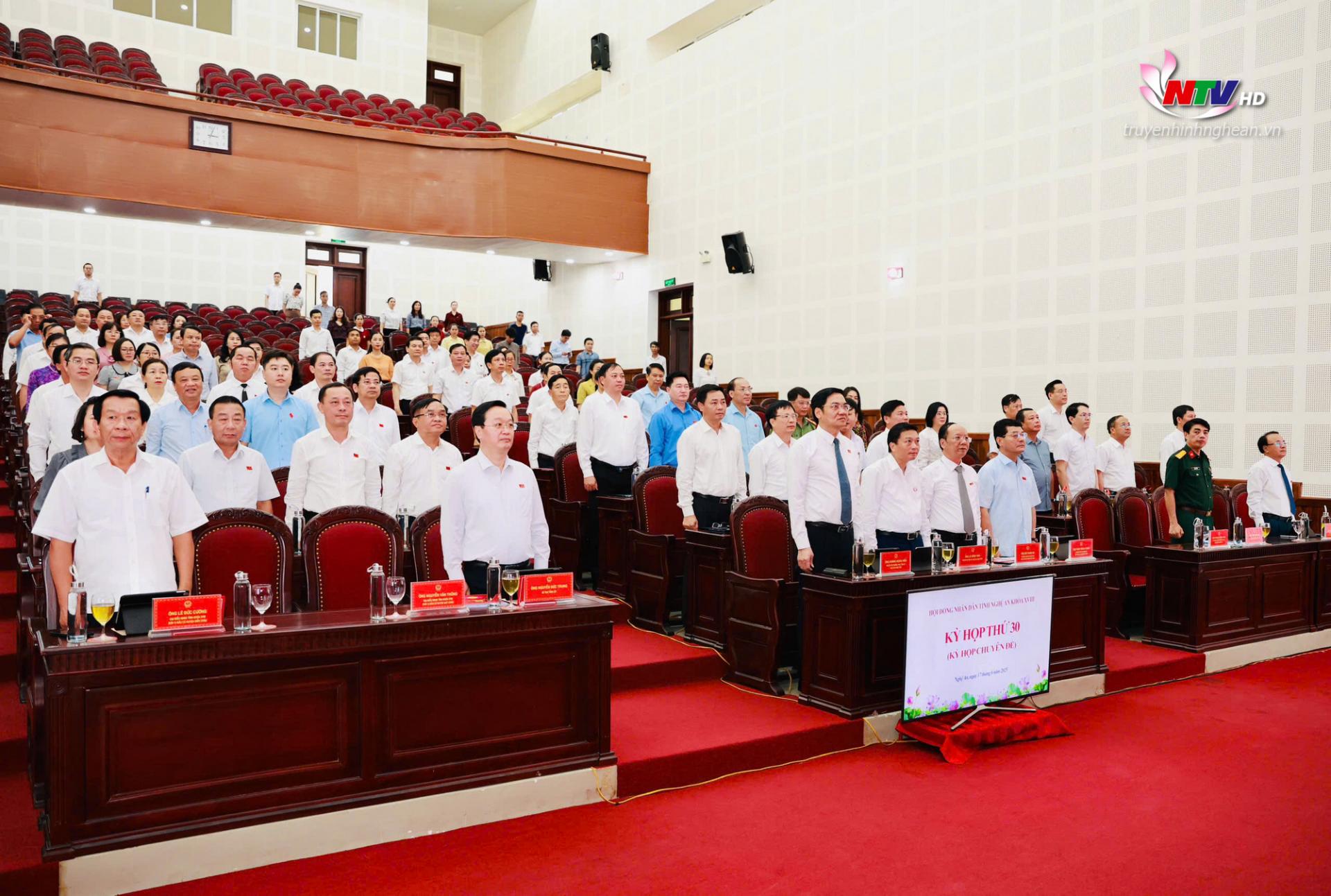 | Các đại biểu thực hiện nghi thức chào cờ Tổ quốc, hát Quốc gia khai mạc Kỳ họp thứ 30, HĐND tỉnh khóa XVIII. |
