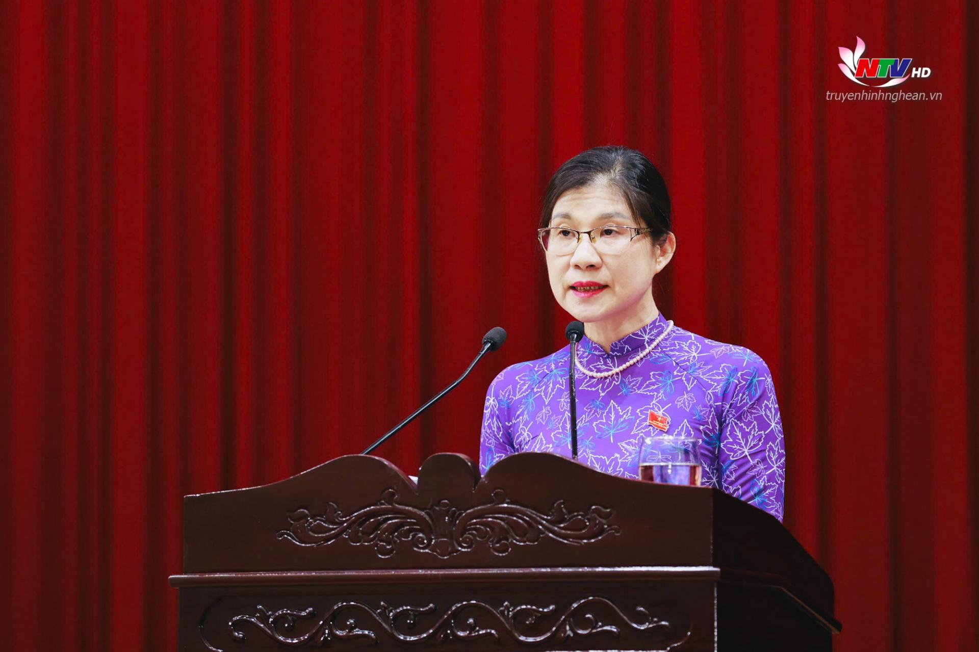 | Đồng chí Lô Thị Kim Ngân - Ủy viên Thường trực, Trưởng ban Dân tộc HĐND tỉnh trình bày báo cáo thẩm tra các tờ trình dự thảo Nghị quyết trình kỳ họp. |