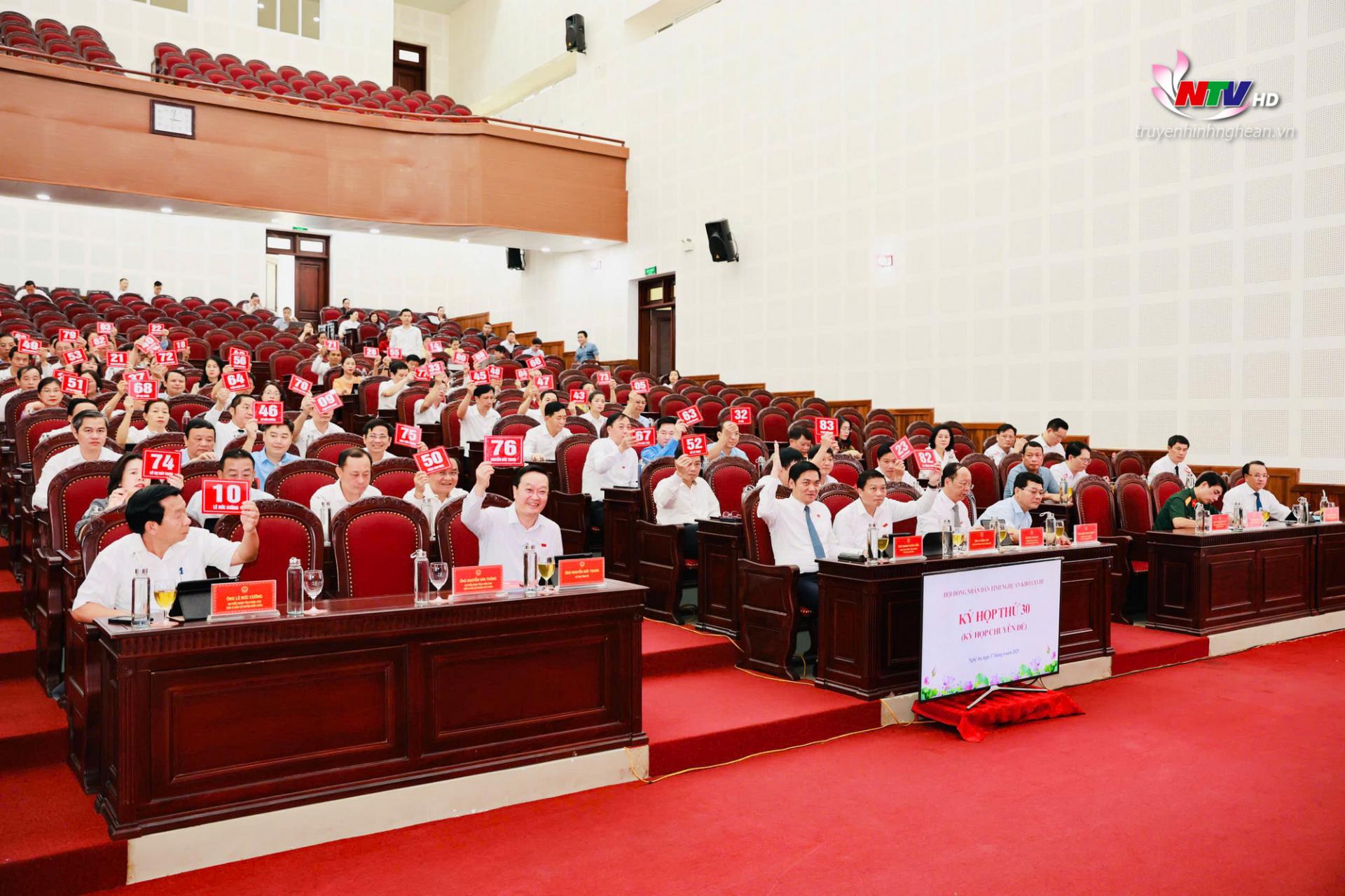 | Các đại biểu HĐND tỉnh biểu quyết thông qua nghị quyết trình kỳ họp. |