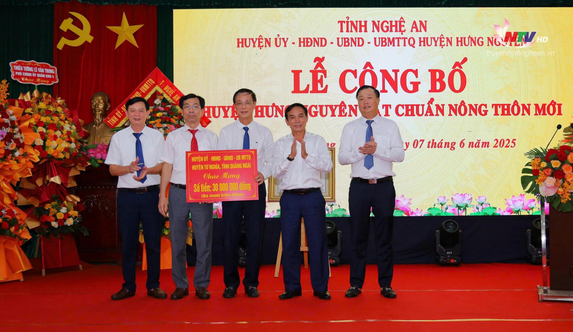 | Huyện Tư Nghĩa, tỉnh Quảng Ngãi trao tặng số tiền 30 triệu đồng cho huyện Hưng Nguyên. |