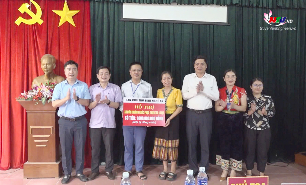 | Đồng chí Hoàng Nghĩa Hiếu và Ban cứu trợ tỉnh hỗ trợ 1,5 tỷ đồng cho xã Nhôn Mai khắc phục thiệt hại do mưa lũ vừa qua. |