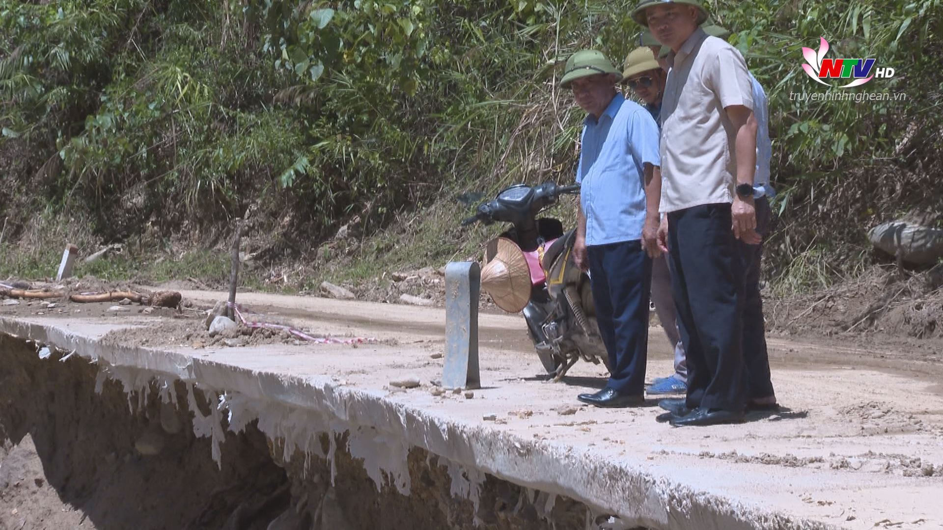 | Đồng chí Nguyễn Văn Đệ kiểm tra điểm vừa chịu ảnh hưởng bởi lũ quét tại xã Nhôn Mai, huyện Tương Dương. |
