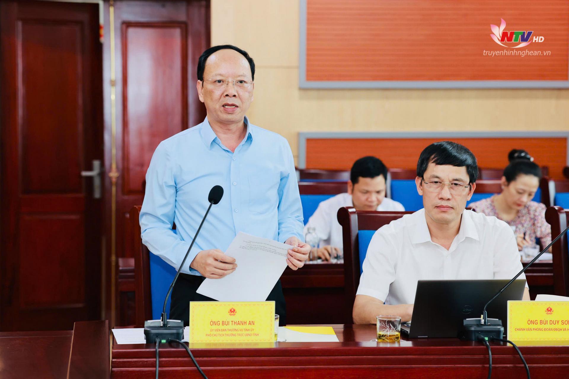 | Đồng chí Bùi Thanh An - Ủy viên Ban Thường vụ Tỉnh ủy, Phó Chủ tịch Thường trực UBND tỉnh phát biểu tại cuộc làm việc. |