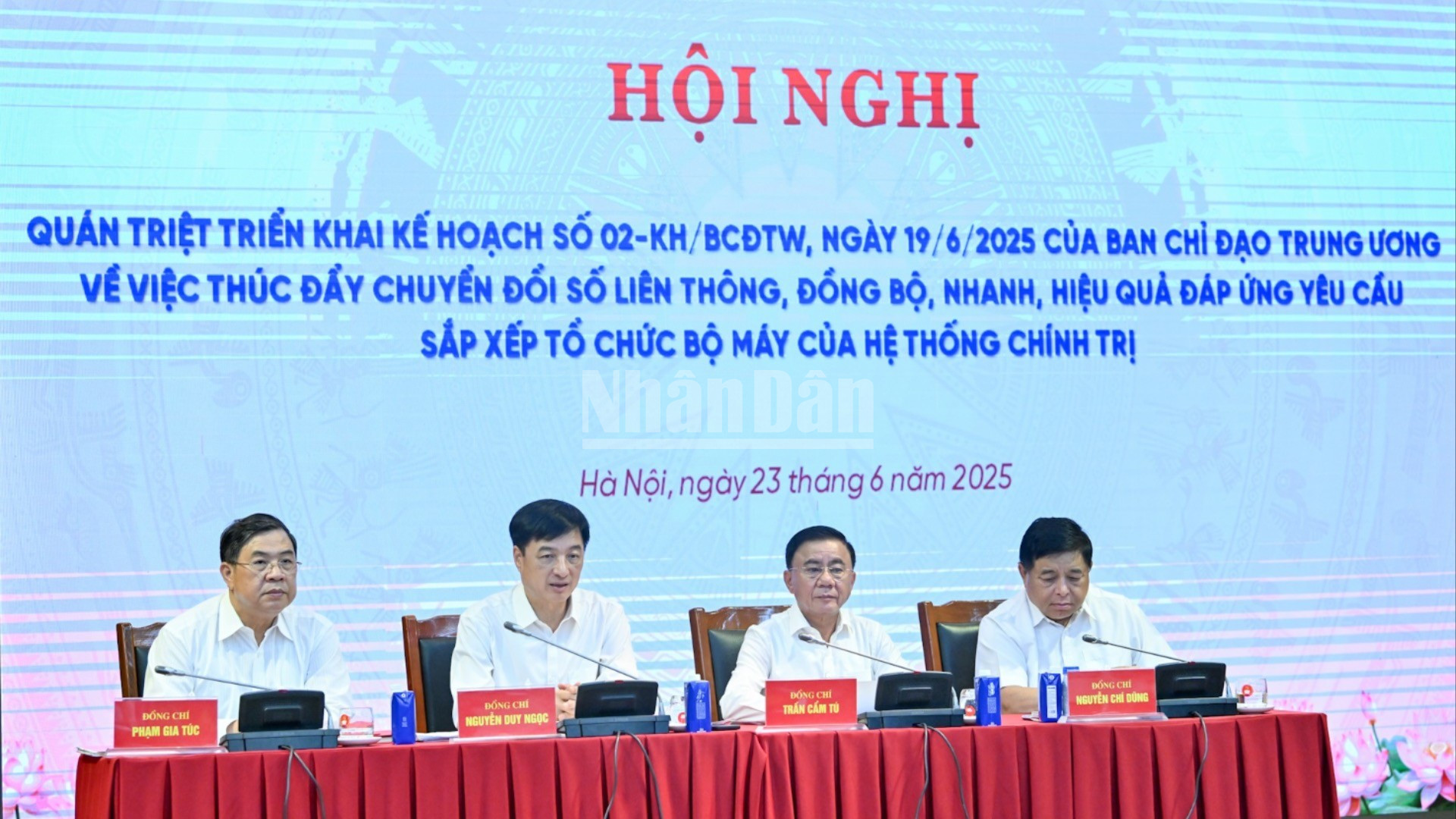 Các đồng chí: Trần Cẩm Tú - Ủy viên Bộ Chính trị, Thường trực Ban Bí thư, Phó Trưởng ban Chỉ đạo Trung ương; Nguyễn Duy Ngọc - Ủy viên Bộ Chính trị, Bí thư Trung ương Đảng, Chủ nhiệm Ủy ban Kiểm tra Trung ương, Phó Trưởng ban Chỉ đạo Trung ương; Nguyễn Chí Dũng - Ủy viên Ban Chấp hành Trung ương Đảng, Phó Thủ tướng Chính phủ; Phạm Gia Túc - Ủy viên Ban Chấp hành Trung ương Đảng, Phó Chánh Văn phòng Trung ương Đảng, Ủy viên Thường trực Ban Chỉ đạo đồng chủ trì hội nghị.