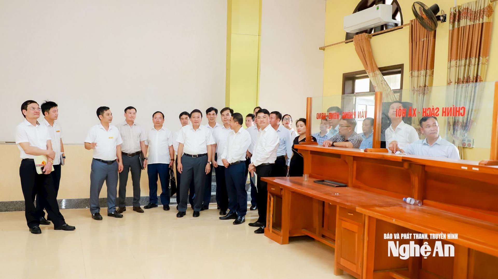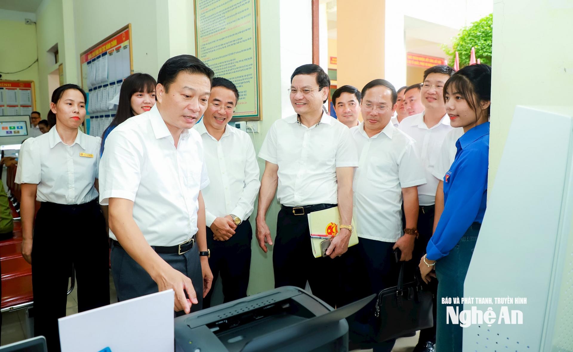 | Đồng chí Lê Hồng Vinh và đoàn công tác kiểm tra trang thiết bị tại Trung tâm Phục vụ hành chính công xã Kim Liên. |