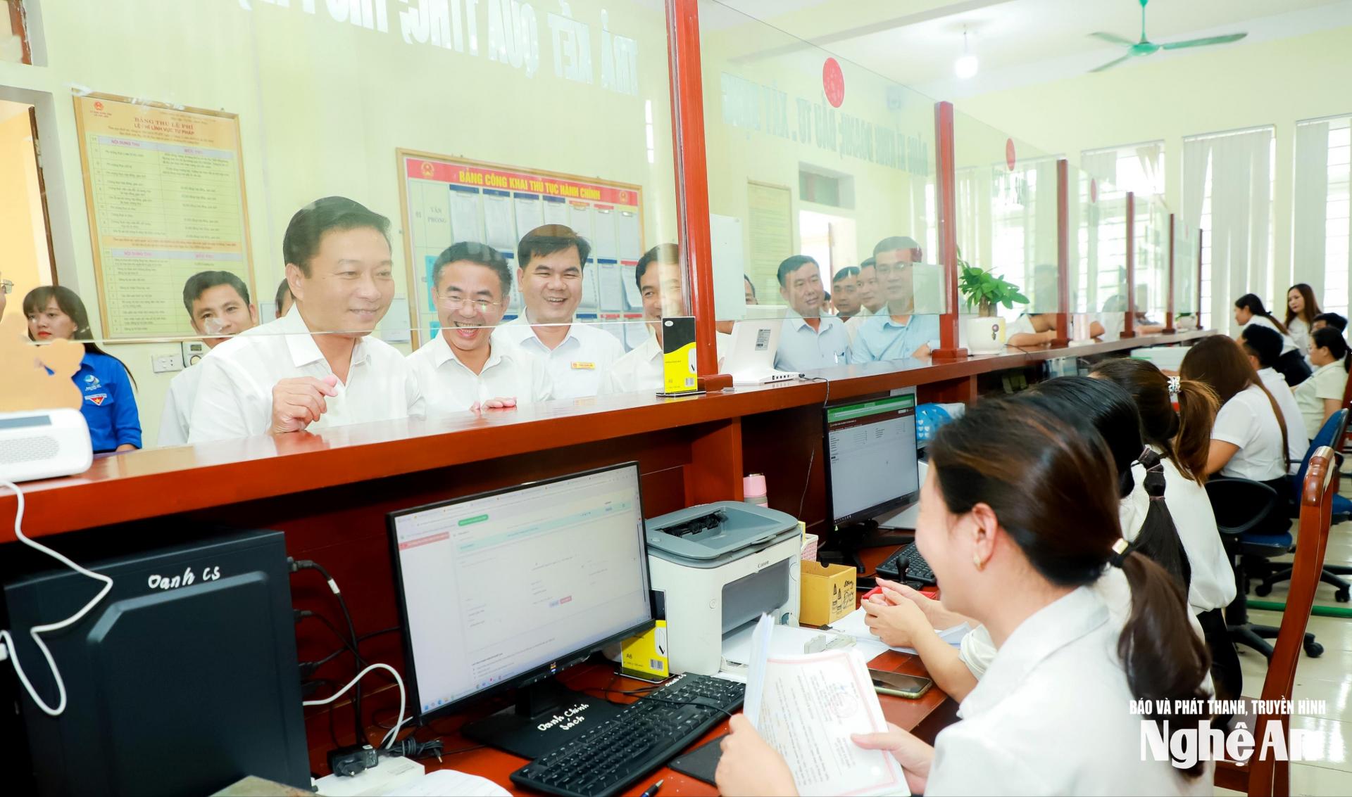 Ngay khi có mặt tại trụ sở UBND xã Kim Liên (đơn vị hành chính được hình thành trên cơ sở sắp xếp, sáp nhập các xã: Hùng Tiến, Nam Cát, Nam Giang, Xuân Hồng, Kim Liên, huyện Nam Đàn cũ) và xã Vạn An (đơn vị hành chính mới được sáp nhập từ thị trấn Nam Đàn và các xã Xuân Hòa, Thượng Tân Lộc, huyện Nam Đàn cũ), đồng chí Lê Hồng Vinh và đoàn công tác đã đến kiểm tra hoạt động tại Trung tâm Phục vụ hành chính công các địa phương.