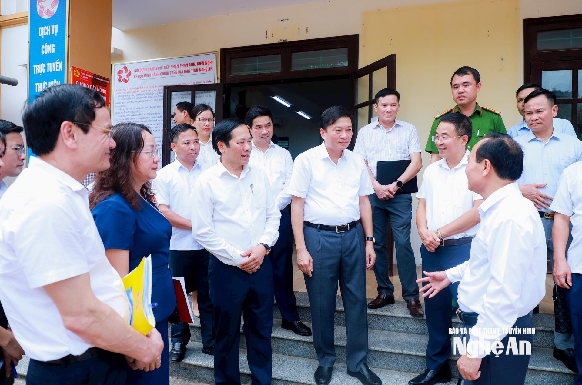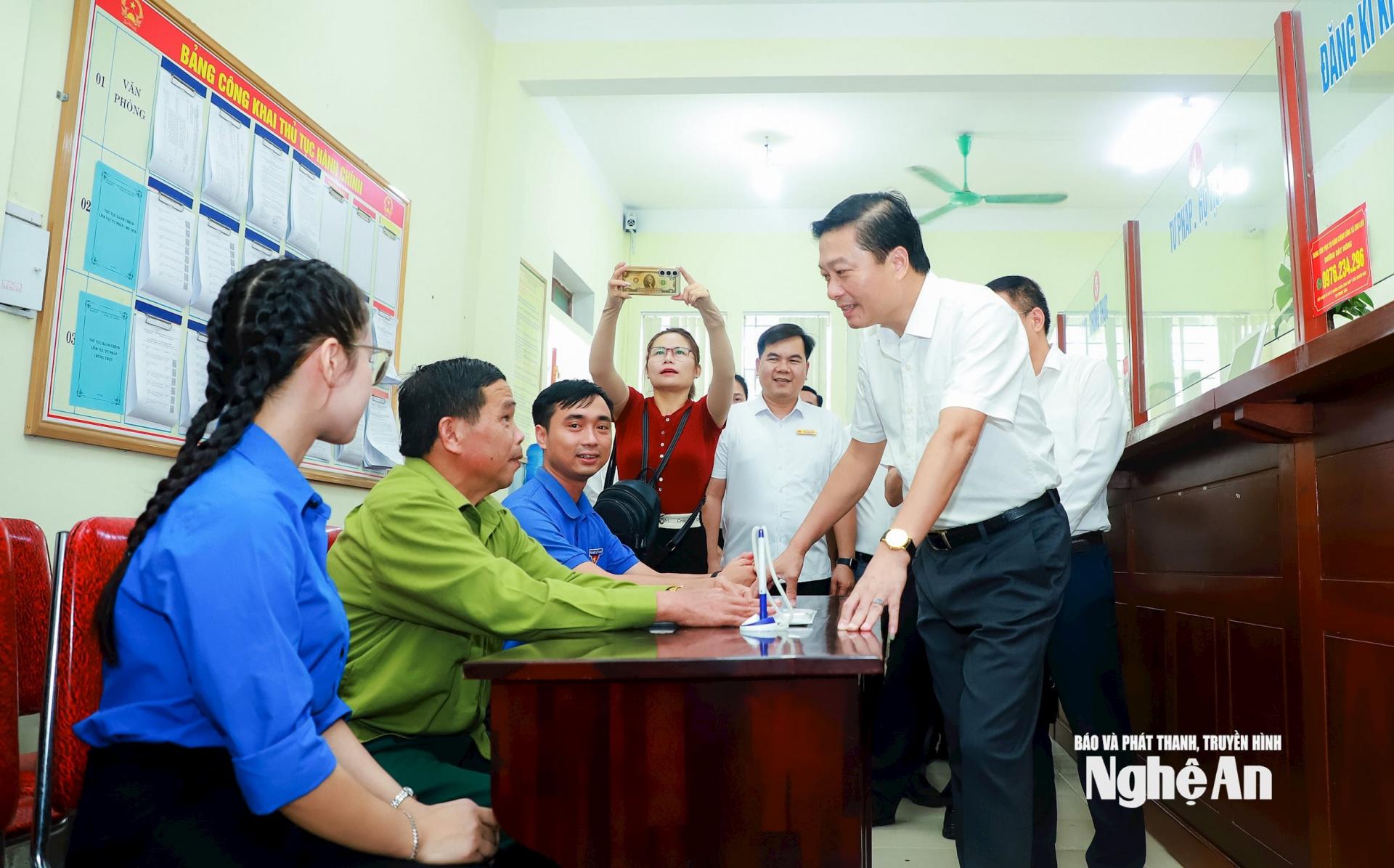 | Chủ tịch UBND tỉnh Lê Hồng Vinh trao đổi trực tiếp với cán bộ, công chức xã Kim Liên về các quy trình tiếp nhận và giải quyết thủ tục hành chính. |
