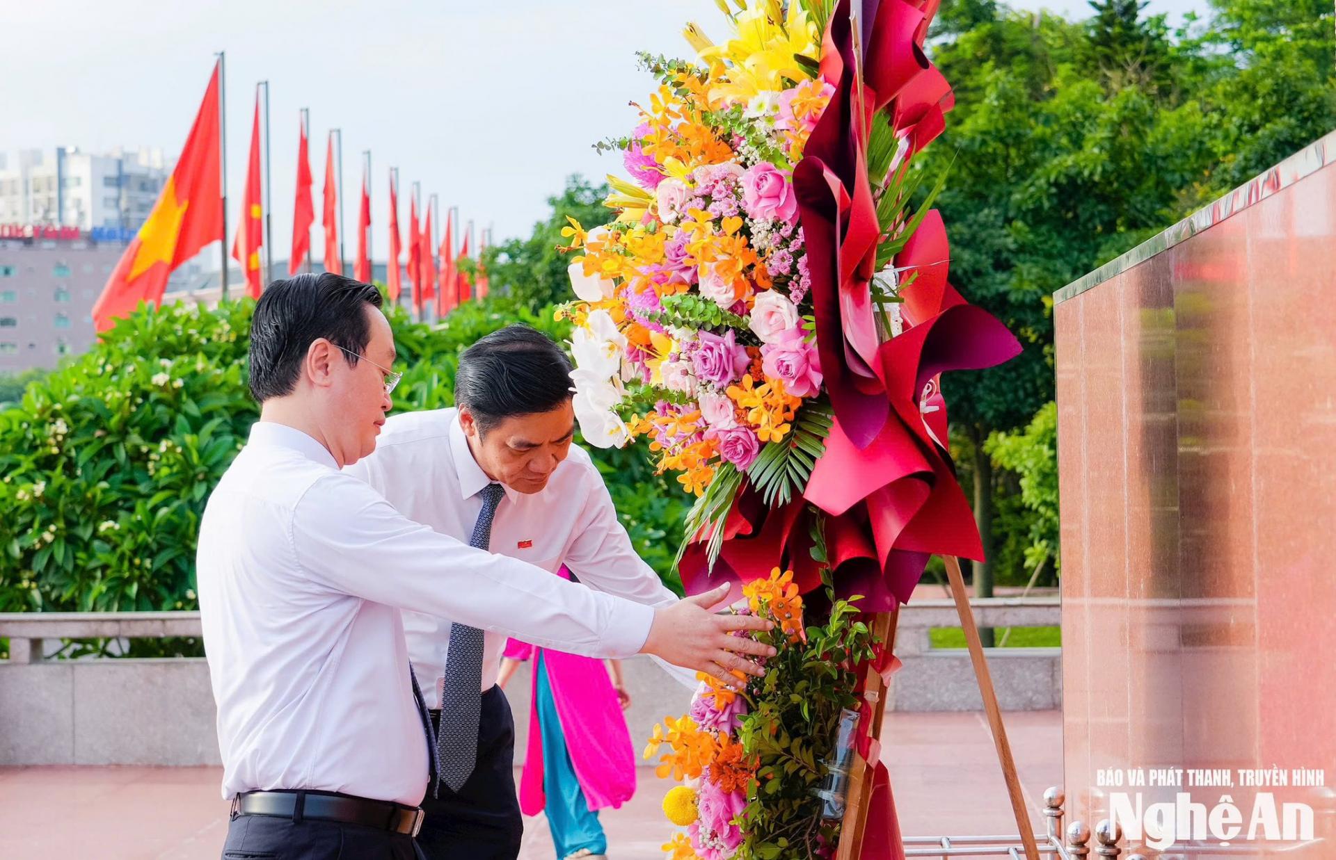 | Các đồng chí: Nguyễn Đức Trung - Bí thư Tỉnh ủy; Hoàng Nghĩa Hiếu - Phó Bí thư Thường trực Tỉnh uỷ, Chủ tịch HĐND tỉnh dâng hoa tưởng niệm Chủ tịch Hồ Chí Minh. |