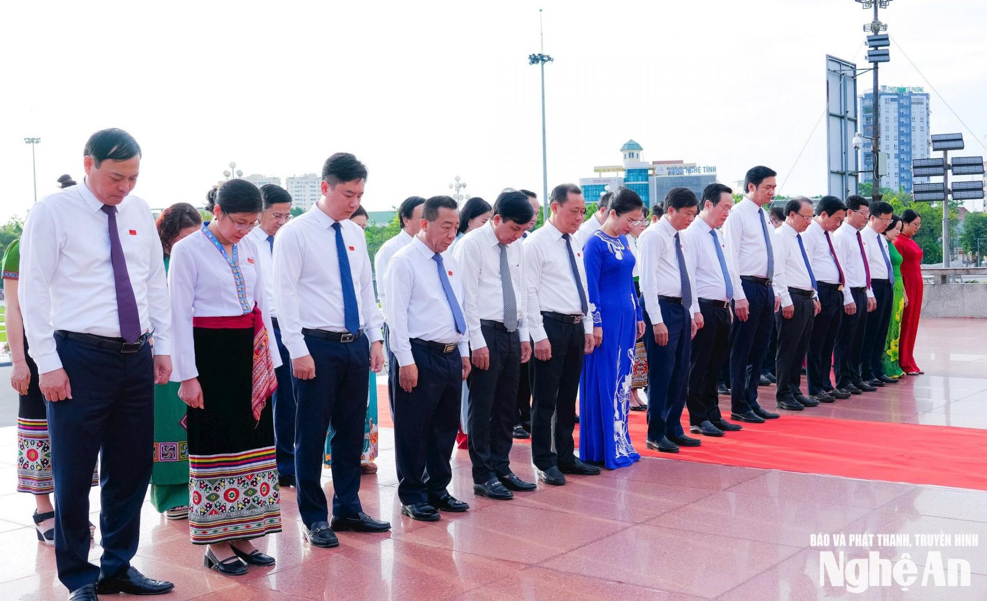 | Các đồng chí lãnh đạo tỉnh, đại biểu HĐND tỉnh dâng hoa tưởng niệm Bác Hồ tại Quảng trường Hồ Chí Minh. |