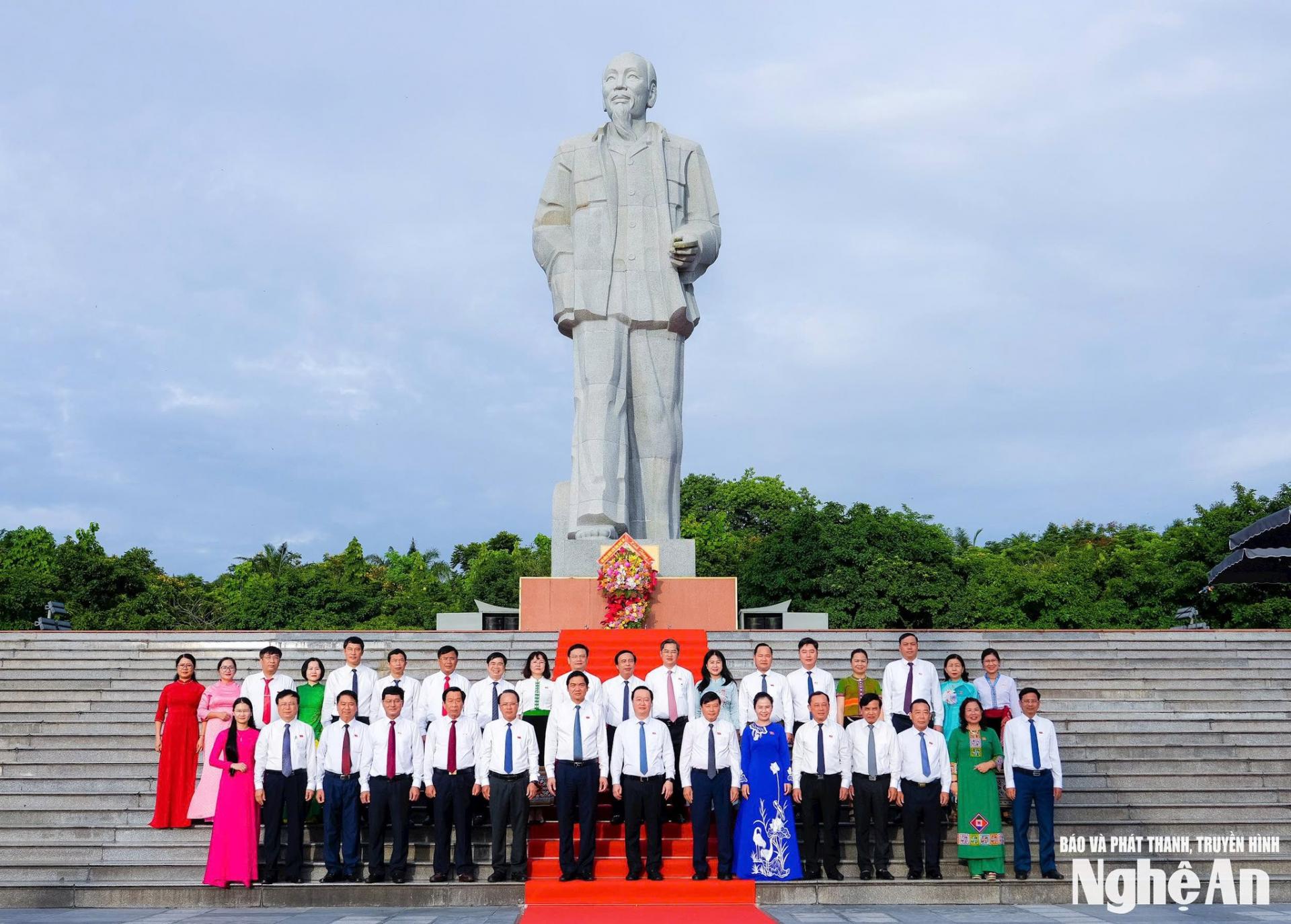 | Đoàn đại biểu HĐND tỉnh Nghệ An chụp ảnh lưu niệm trước Tượng đài Bác Hồ tại Quảng trường Hồ Chí Minh. |