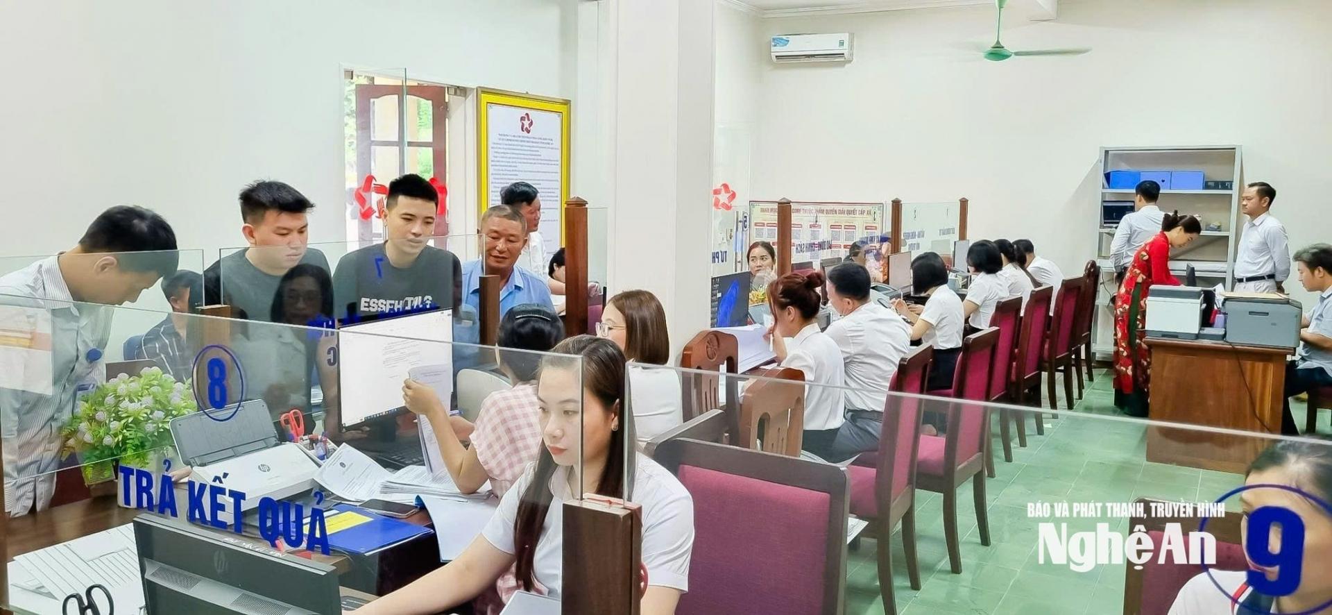 | Cán bộ phường Vinh Lộc, Nghệ An giải quyết thủ tục hành chính cho người dân. |