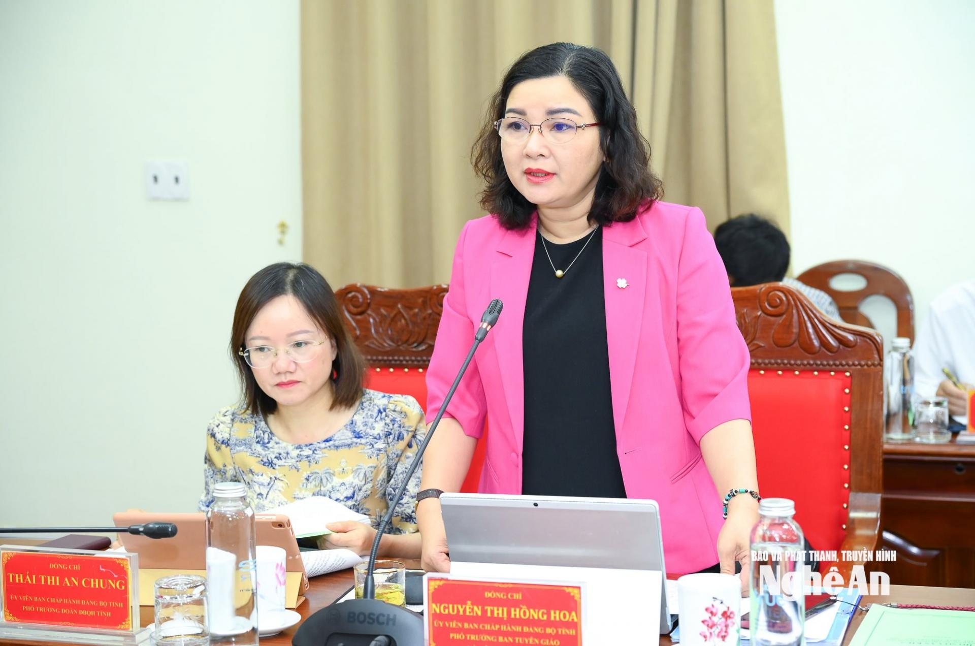 | Đồng chí Nguyễn Thị Hồng Hoa - Ủy viên BCH Đảng bộ tỉnh, Phó trưởng Ban Tuyên giáo và Dân vận Tỉnh ủy phát biểu tại cuộc làm việc. |