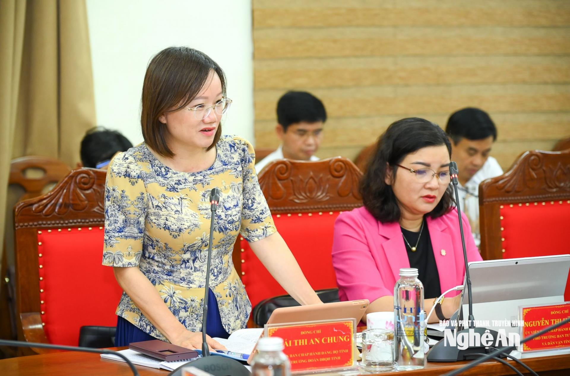 | Đồng chí Thái Thị An Chung - Ủy viên BCH Đảng bộ tỉnh, Phó trưởng Đoàn chuyên trách Đoàn đại biểu Quốc hội tỉnh phát biểu tại cuộc làm việc. |
