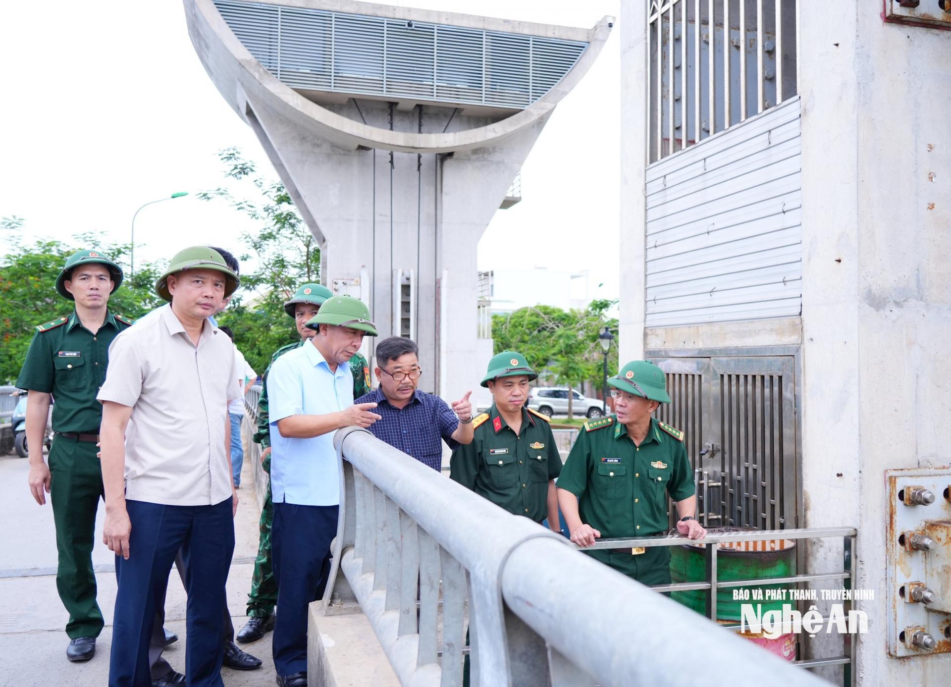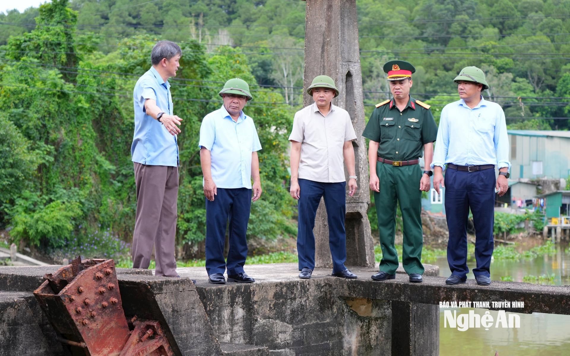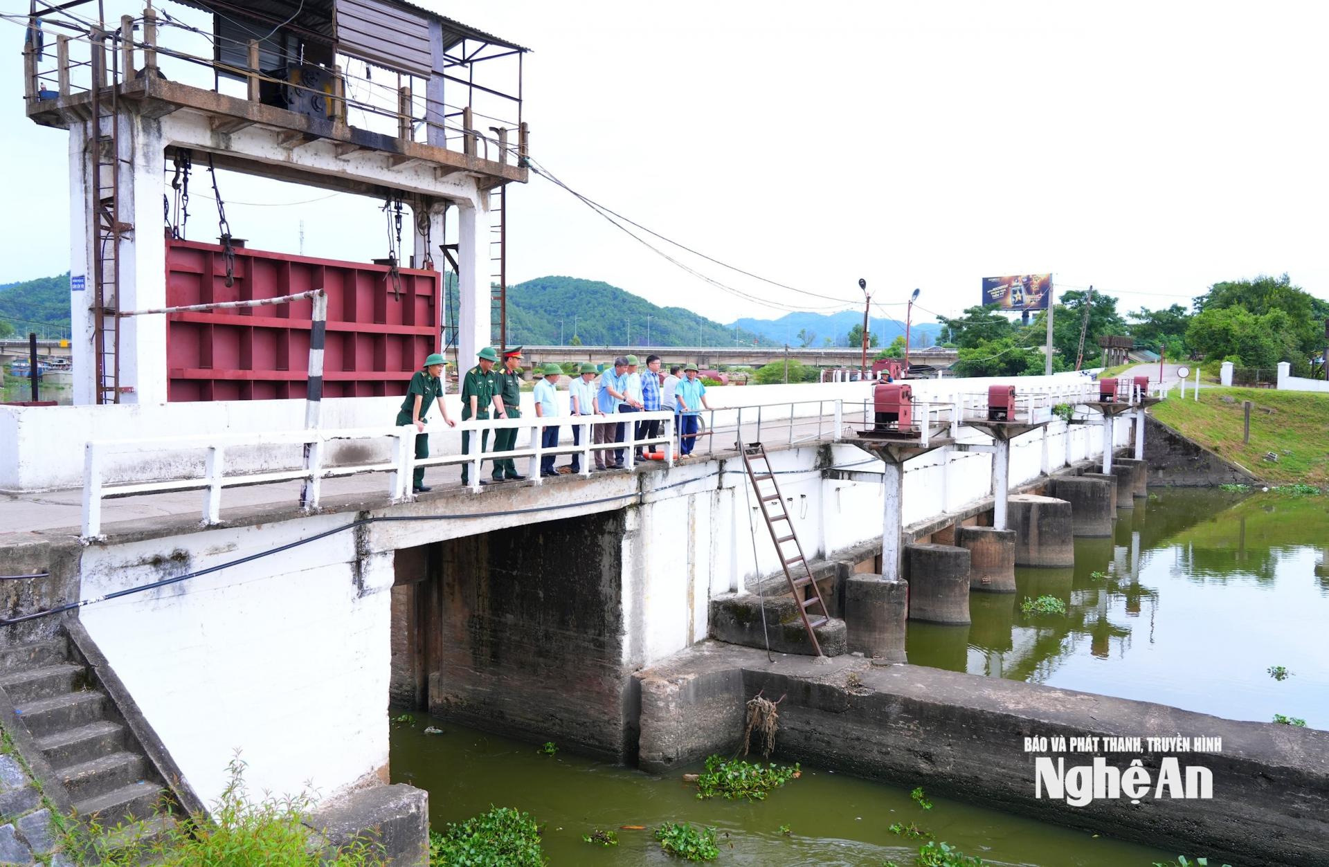 | Đoàn kiểm tra tại Bara Bến Thủy - công trình có tác dụng ngăn mặn, giữ ngọt, tiêu thoát lũ cho địa bàn các xã Trường Vinh, Thành Vinh, Vinh Phú, Hưng Nguyên. Ảnh: Thành Cường |