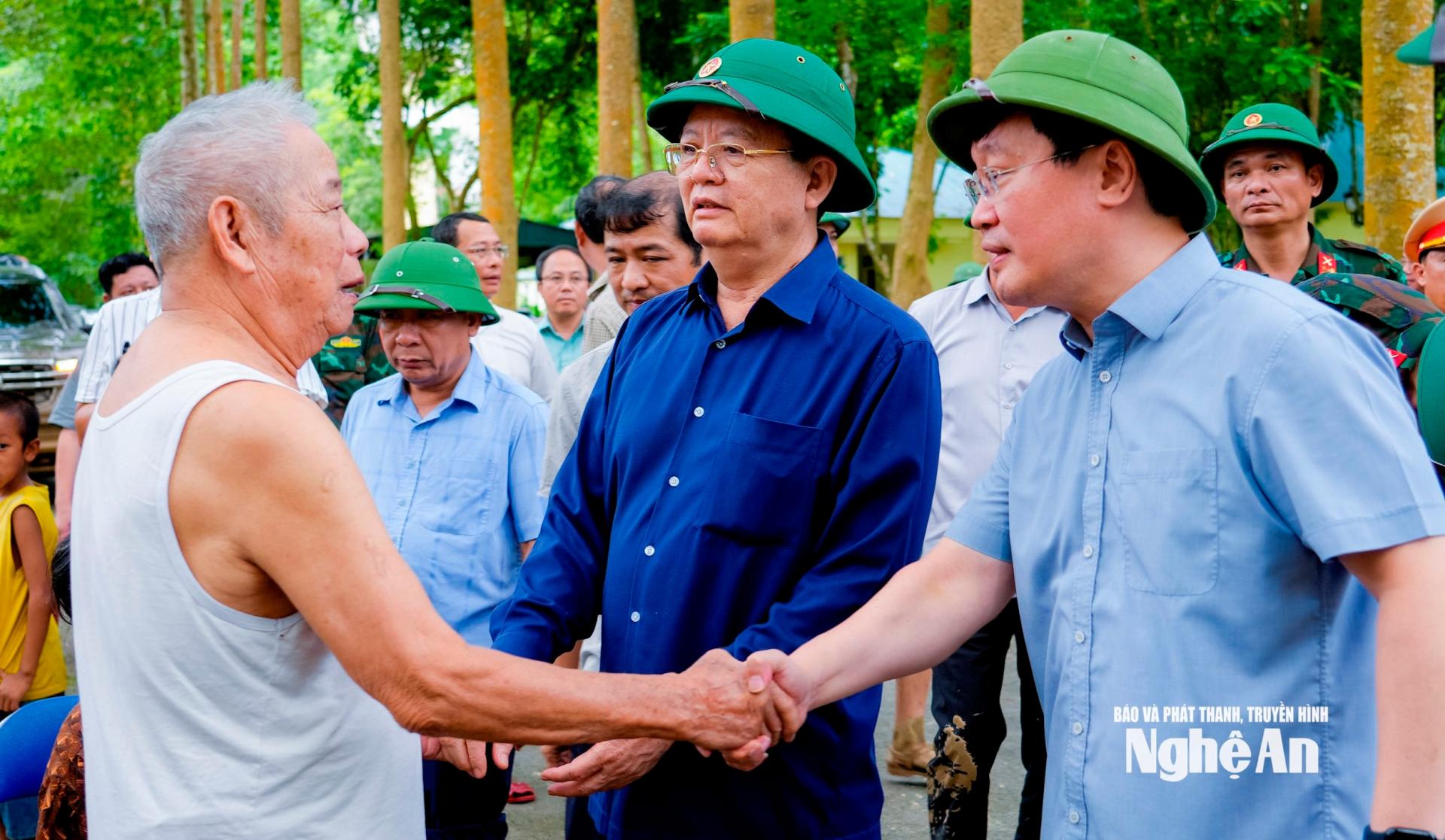 Tại hiện trường, Bí thư Tỉnh ủy Nguyễn Đức Trung nhấn mạnh, thực hiện nghiêm túc chỉ đạo của Ban Bí thư, Thủ tướng Chính phủ, Bộ Nông nghiệp và Môi trường trong công tác ứng phó, khắc phục mưa lũ, tỉnh Nghệ An đã khẩn trương huy động mọi lực lượng, phương tiện hỗ trợ di dời người dân và tài sản đến nơi an toàn với quan điểm bảo vệ tuyệt đối an toàn tính mạng và tài sản cho nhân dân.