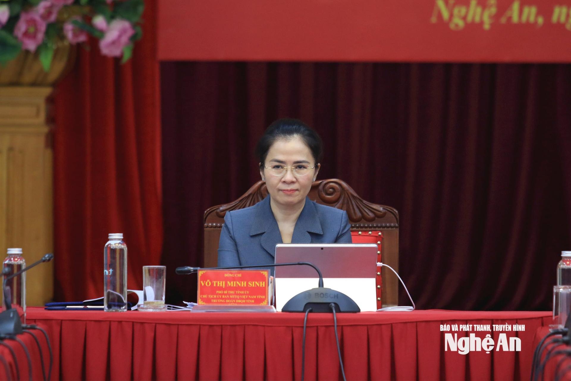 | Đồng chí Võ Thị Minh Sinh – Phó Bí thư Tỉnh uỷ, Chủ tịch Uỷ ban Mặt trận Tổ quốc tỉnh, Trưởng đoàn đại biểu Quốc hội tỉnh chủ trì hội nghị tại điểm cầu Nghệ An. |