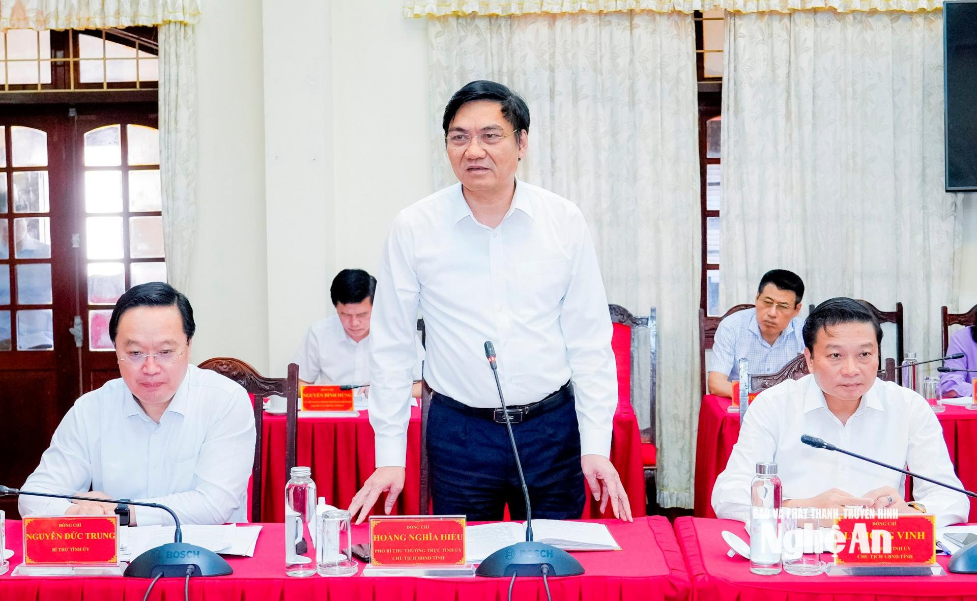 | Đồng chí Hoàng Nghĩa Hiếu - Phó Bí thư Thường trực Tỉnh ủy, Chủ tịch HĐND tỉnh phát biểu tại cuộc làm việc. Ảnh: Phạm Bằng |