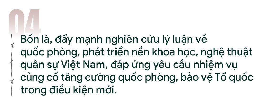 Tập trung nghiên cứu những vấn đề về ứng dụng khoa học quân sự, thành tựu của khoa học, công nghệ để phát triển lý luận về quốc phòng, nghệ thuật quân sự Việt Nam, nghệ thuật chiến tranh nhân dân bảo vệ Tổ quốc trong tình hình mới. Tổ chức tổng kết các hoạt động quân sự, quốc phòng; kết quả triển khai thực hiện chủ trương của Đảng về xây dựng nền quốc phòng toàn dân, chiến tranh nhân dân, rút ra những vấn đề lý luận và thực tiễn quá trình triển khai thực hiện các nghị quyết, kết luận, chỉ thị của Đảng về quân sự, quốc phòng, bảo vệ Tổ quốc.