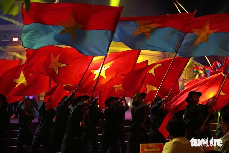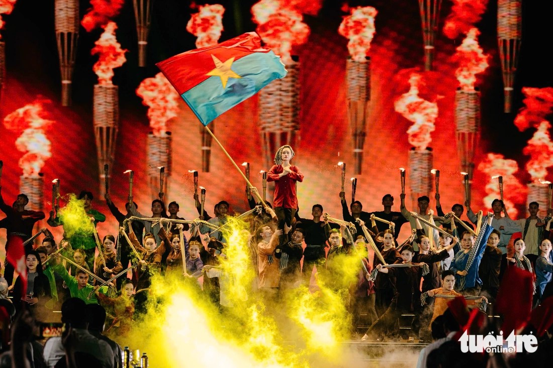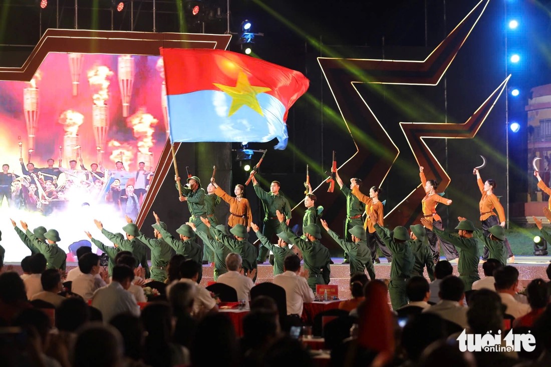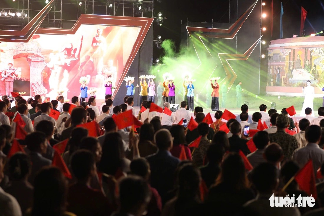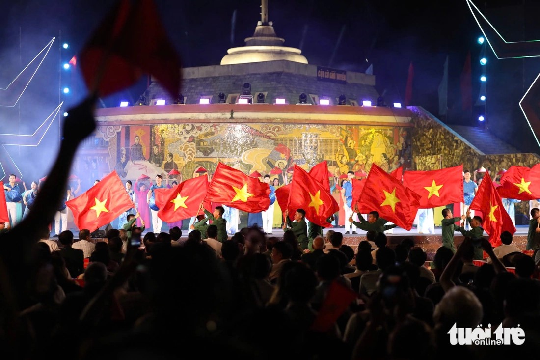 | Đại biểu và khán giả đồng loạt đứng dậy vẫy cờ trong tiết mục Miền xa thẳm - Khát vọng ở đầu cầu Quảng Trị. |