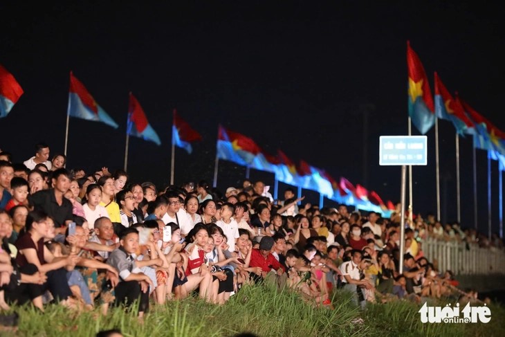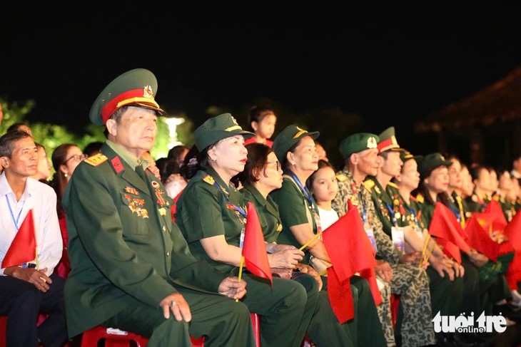 | Các cựu chiến binh, khán giả xem chương trình bên cầu Hiền Lương, tại di tích quốc gia đặc biệt Đôi bờ Hiền Lương - Bến Hải. Phía sau là hàng dài cờ giải phóng trên cầu Hiền Lương mới, trên Quốc lộ 1. |
