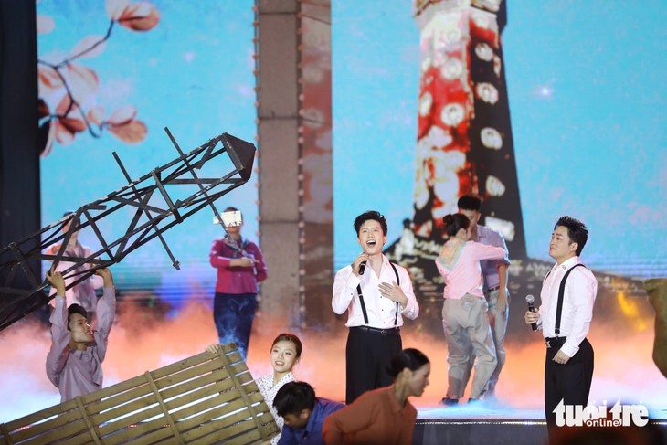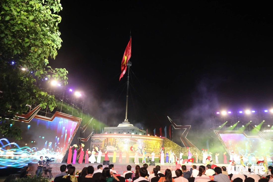 | Sân khấu tại Quảng Trị ngay chân kỳ đài ở di tích quốc gia đặc biệt Đôi bờ Hiền Lương - Bến Hải. Lá cờ trên kỳ đài rộng 75m2, nhằm nhắc nhở thế hệ sau này về thời khắc đặc biệt năm 1975. |