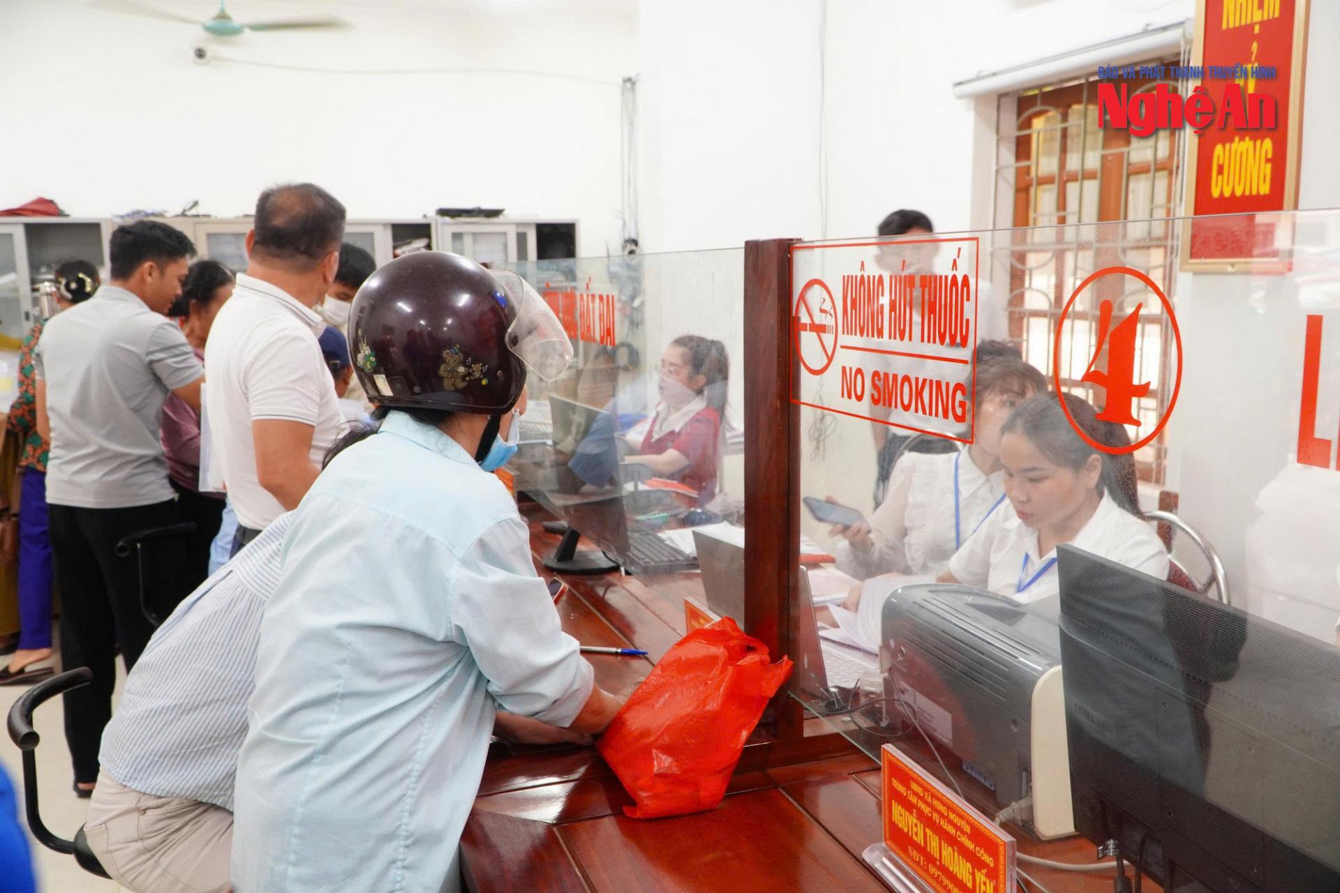 | Người dân chờ đợi và nộp hồ sơ tại Trung tâm Phục vụ Hành chính công xã Hưng Nguyên trong không khí trật tự, chuyên nghiệp. |