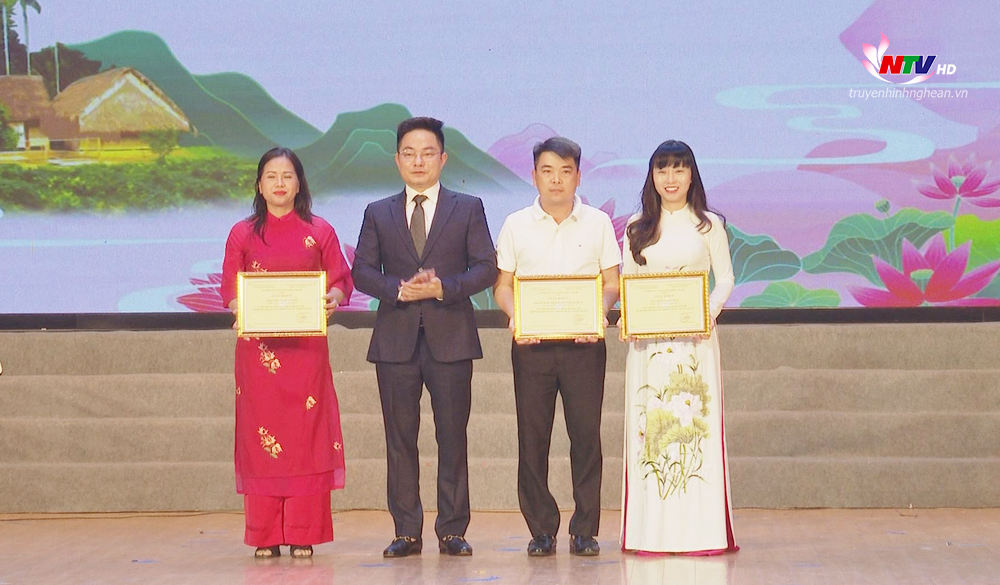 | Lãnh đạo Cục Văn hóa cơ sở, Gia đình và Thư viện, Bộ Văn hóa - Thể thao và Du lịch và Sở Văn hóa, Thể thao và Du lịch tỉnh Nghệ An trao Huy chương Vàng cho các tiết mục tiêu biểu của Hội diễn. |